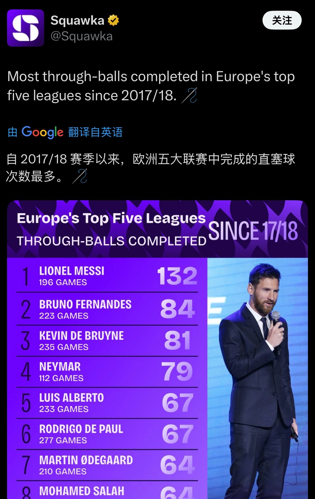 自2017/18赛季以来,欧洲五大联赛中完成的直塞球次数最多的球员🪡我梅都离开