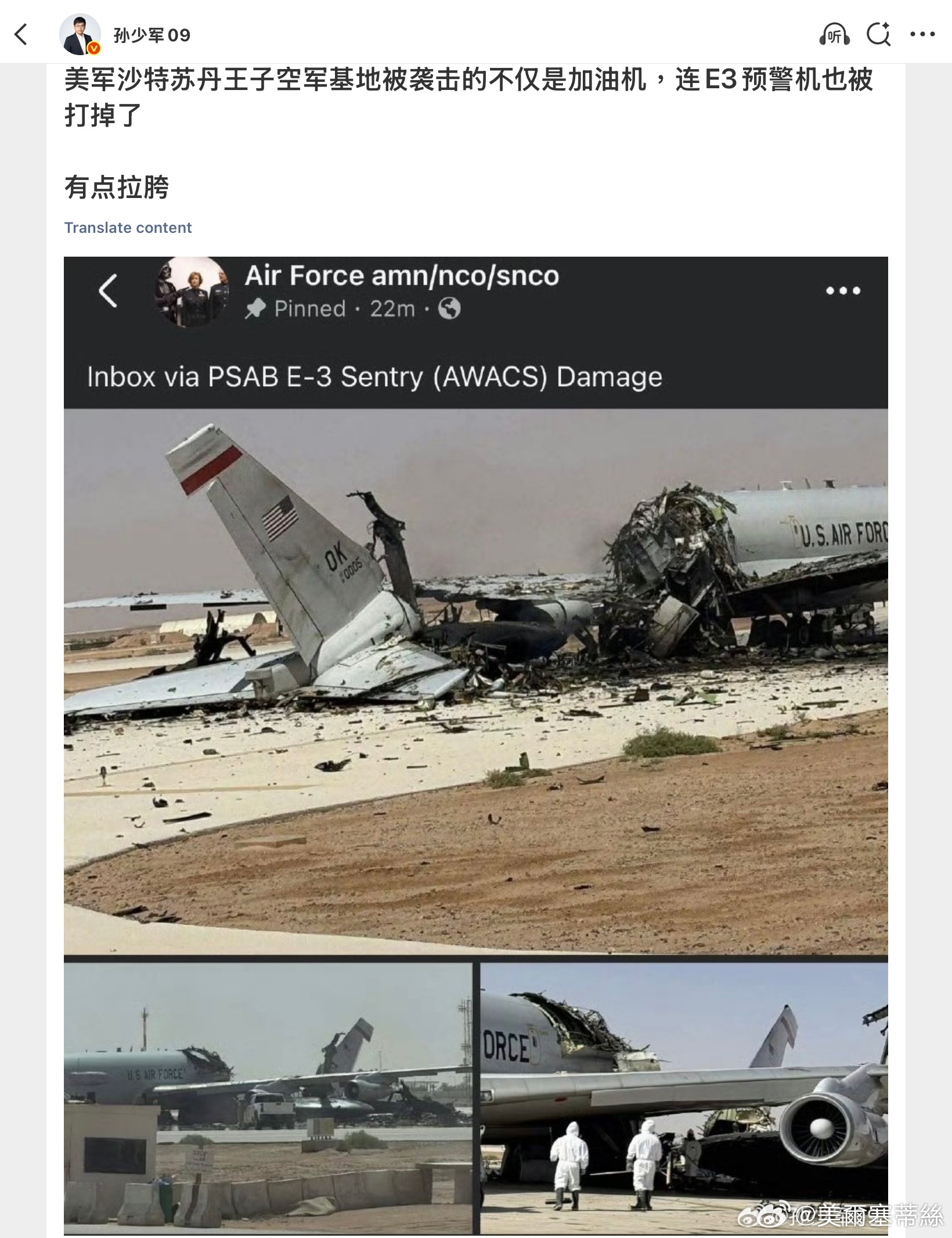 有消息說美军沙特苏丹王子空军基地被袭击的不仅是加油机,连E3预警机也被打掉了。