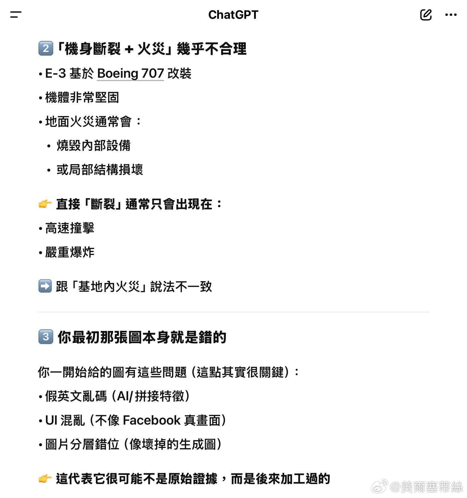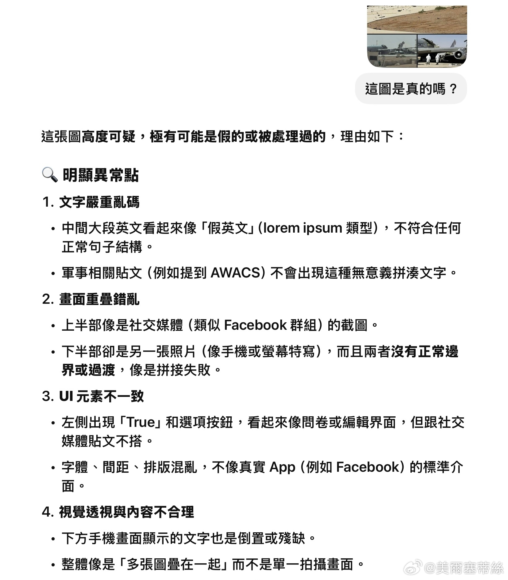ChatGPT得出的結論是 :這張圖高度可疑,極有可能是假的或被處理過的。這不是一張可信的原始截圖,更像是拼接/合成圖、或生成式 AI/修圖軟體產生的錯誤畫面、或刻意製造的「假訊息素材」。
