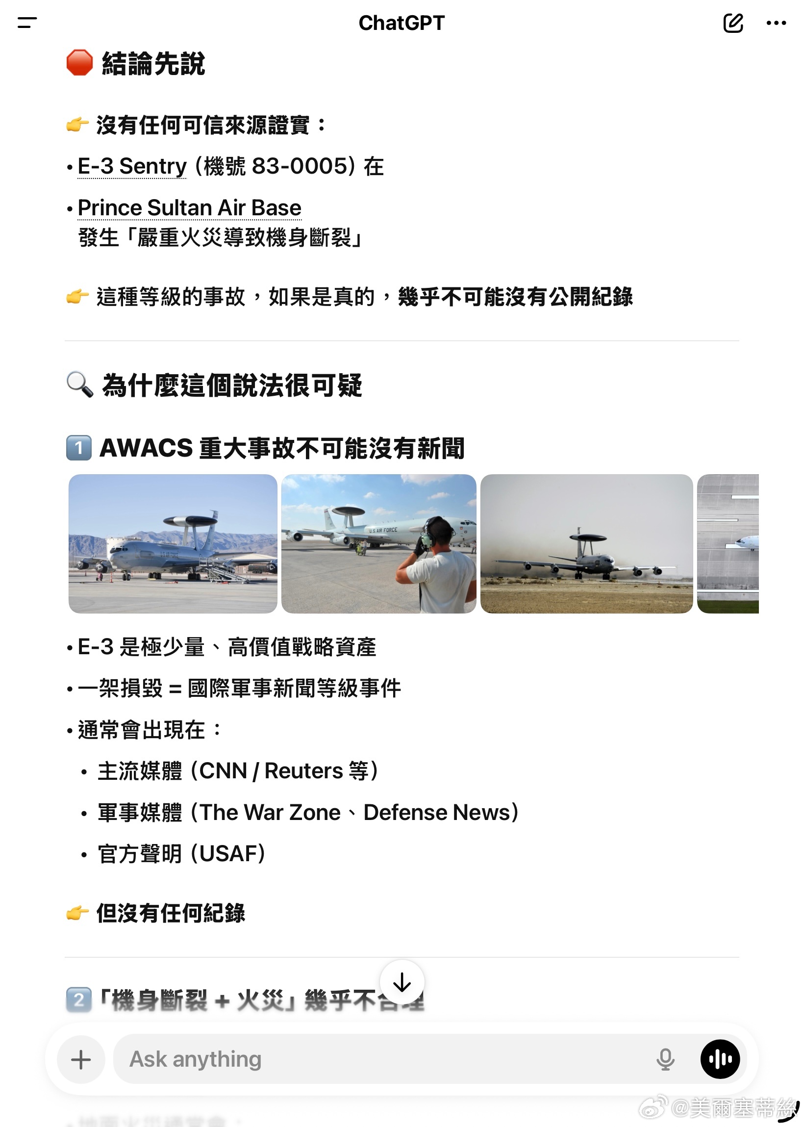 有消息說美军沙特苏丹王子空军基地被袭击的不仅是加油机,连E3预警机也被打掉了。C