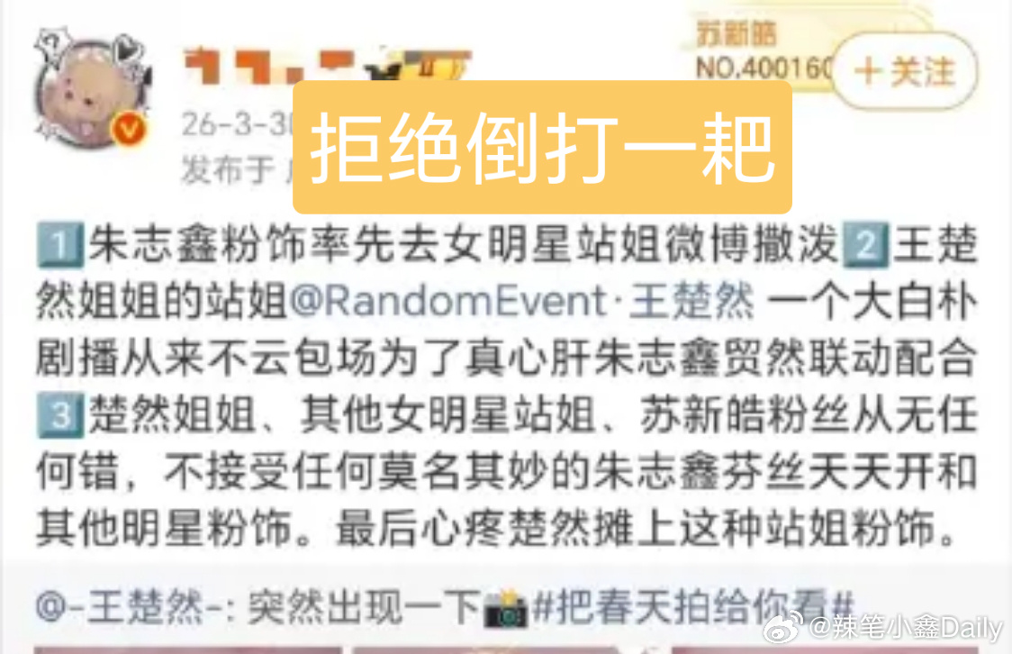 王楚然转发区只能说大美女wwzz,苏新皓粉丝不满意🚢丝发朱志鑫是假的,想和大美