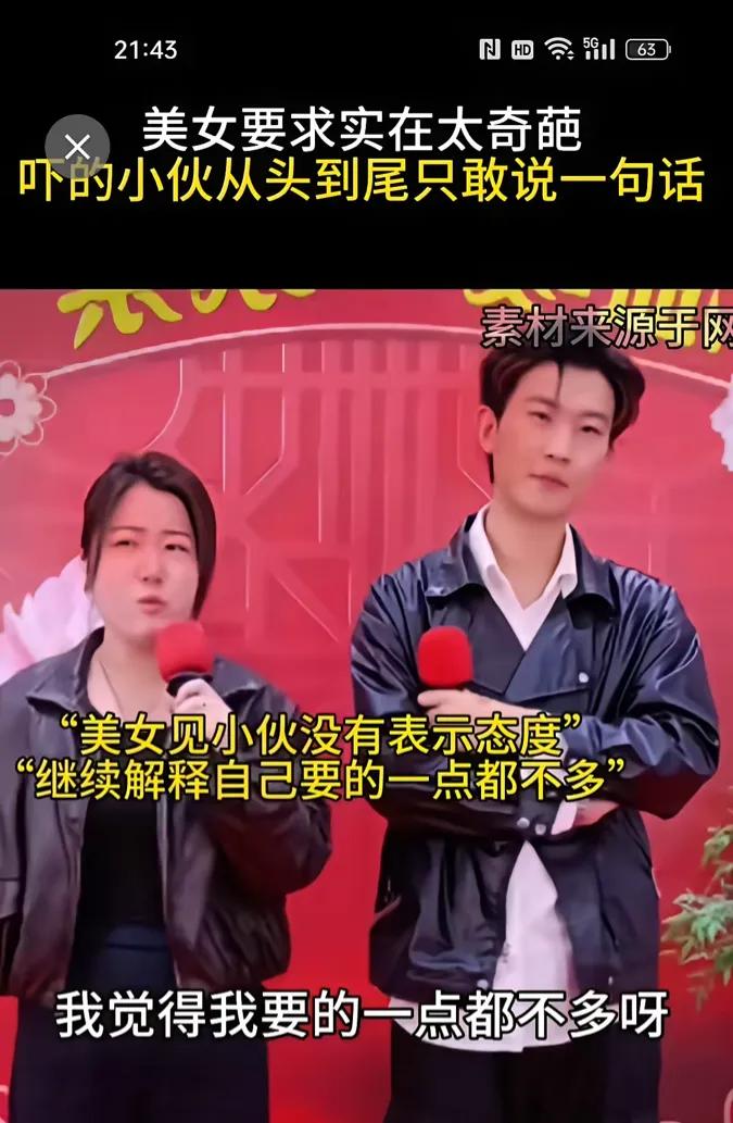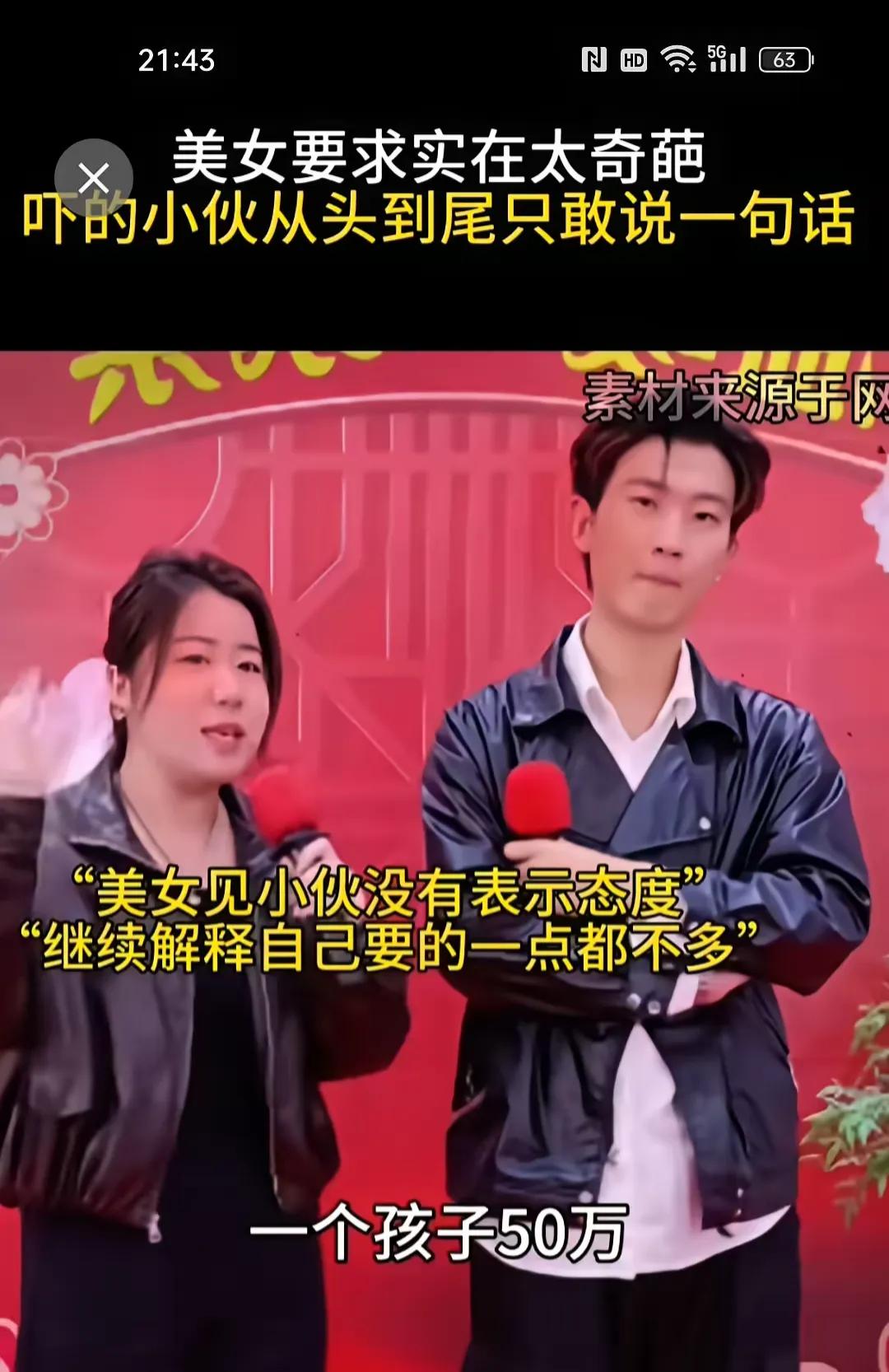 相亲节目上。女方要求生个女儿给30万,生个男孩给50万。只要生孩子就有回报。还直言她觉得要的这个钱一点也不多,因为她生孩子的痛苦是10根肋骨一起折断。要这个钱一点也不多。男方听后都无奈了。 镜头里的相亲现场,红背景板衬得气氛格外热闹,女嘉宾拿着话筒,一脸理直气壮地说出自己的要求,旁边的男嘉宾全程抱着胳膊,脸色从期待变错愕,最后只剩满脸无奈,从头到尾愣是没敢多说一句话。 女嘉宾越说越起劲,直接把生孩子明码标价,说生女儿给30万,生儿子给50万,还强调自己要的真不多。她搬出生孩子的痛苦,说那是10根肋骨同时折断的级别,这点钱根本配不上自己受的罪。 这话一出来,别说台上的男嘉宾懵了,屏幕前的网友都看傻了。有人说,生孩子确实辛苦,要补偿也能理解,但把孩子当成明码标价的商品,一上来就谈钱,这哪是相亲,分明是谈生意。也有人说,女嘉宾把生育痛苦当成筹码,看似是为自己争取权益,实则把婚姻和感情彻底物化了。 其实大家都懂,生孩子是女人一辈子的大事,孕期的辛苦、分娩的剧痛、产后的恢复,每一步都不容易,男方给女方足够的补偿和保障,本来就是天经地义的事。但问题是,保障是基于感情和责任,不是一上来就把孩子标上价码,把婚姻做成交易。 更让人唏嘘的是,女嘉宾觉得自己要的不多,可她没意识到,真正的婚姻里,爱和尊重从来不是用钱能买来的。如果一上来就谈钱,把生孩子当成赚钱的工具,那往后的日子里,感情只会越来越淡,剩下的全是算计。 男嘉宾全程的无奈,其实就是大多数普通人的心声。谁都想找个能好好过日子的人,而不是一上来就跟你算钱、谈条件的合伙人。这种把生育明码标价的要求,别说男方接受不了,就连很多女生都觉得离谱。 也有网友调侃,这哪是相亲,分明是来开价的,真要是答应了,往后生几个、生男生女都成了交易,日子根本没法过。还有人说,女嘉宾看似是在为自己争取权益,实则是把自己放在了商品的位置上,反而丢了底气。 婚姻的基础从来不是钱,而是两个人互相体谅、互相扶持。生孩子的痛苦值得被尊重,女方的权益也该被保障,但绝不是用这种明码标价的方式,把感情和孩子都当成交易的筹码。 各位读者你们怎么看?欢迎在评论区讨论。