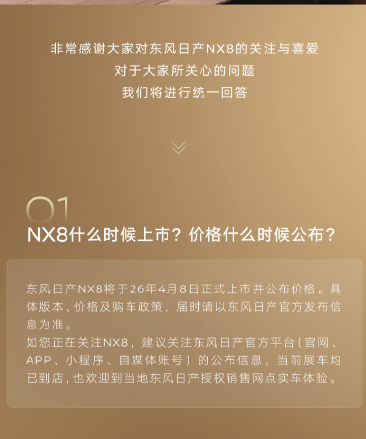 车若初见 东风日产NX8定档4月8日正式上市,外号“大大大五座”,得房率83%,后排膝部空间760mm,零重力云感大沙发,前后排都带通风加热按摩,双动力,纯电800V平台,12分钟快充80%,6分钟补能300km;增程版综合续航1450km,长途自驾无焦虑。高通8295P芯片+双15.6英寸大屏,带激光雷达、三电终身质保。预售留了个小悬念,没有公布价格,日系大8系您觉得会定啥价格。