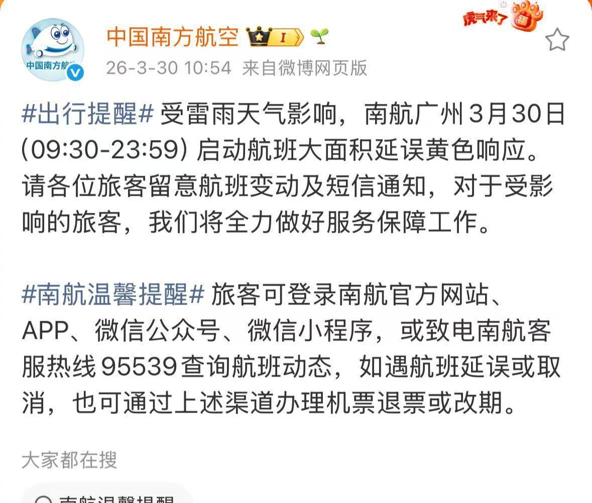 南航启动航班大面积延误黄色响应。受雷雨天气影响,南航广州3月30日(09:30-23:59)启动航班大面积延误黄色响应。旅客周小姐表示,本来买了南航当日12:30广州飞武汉的机票,早上一觉醒来发现航班延误,可以免费退改,于是她直接退票了。