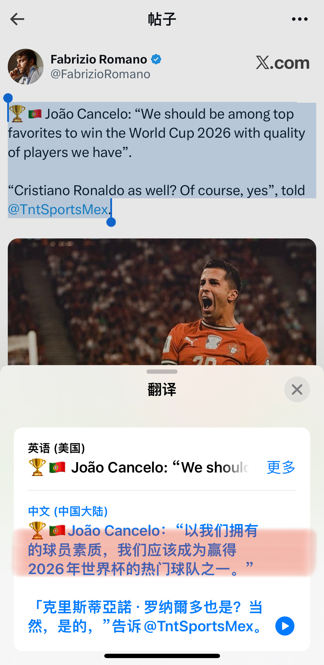 坎塞洛:“凭借我们拥有的球员质量,我们应该成为2026年世界杯夺冠的热门之一”。