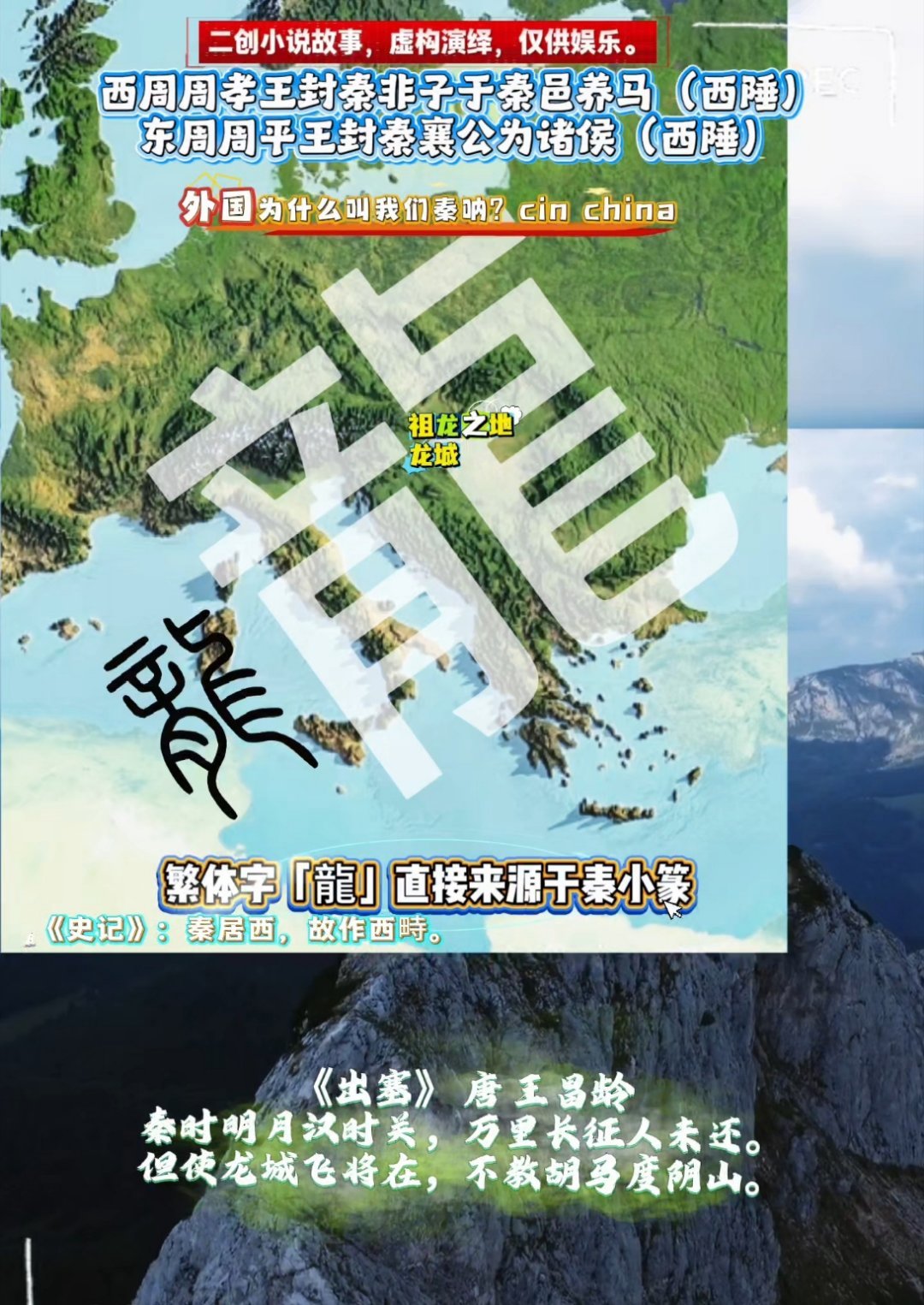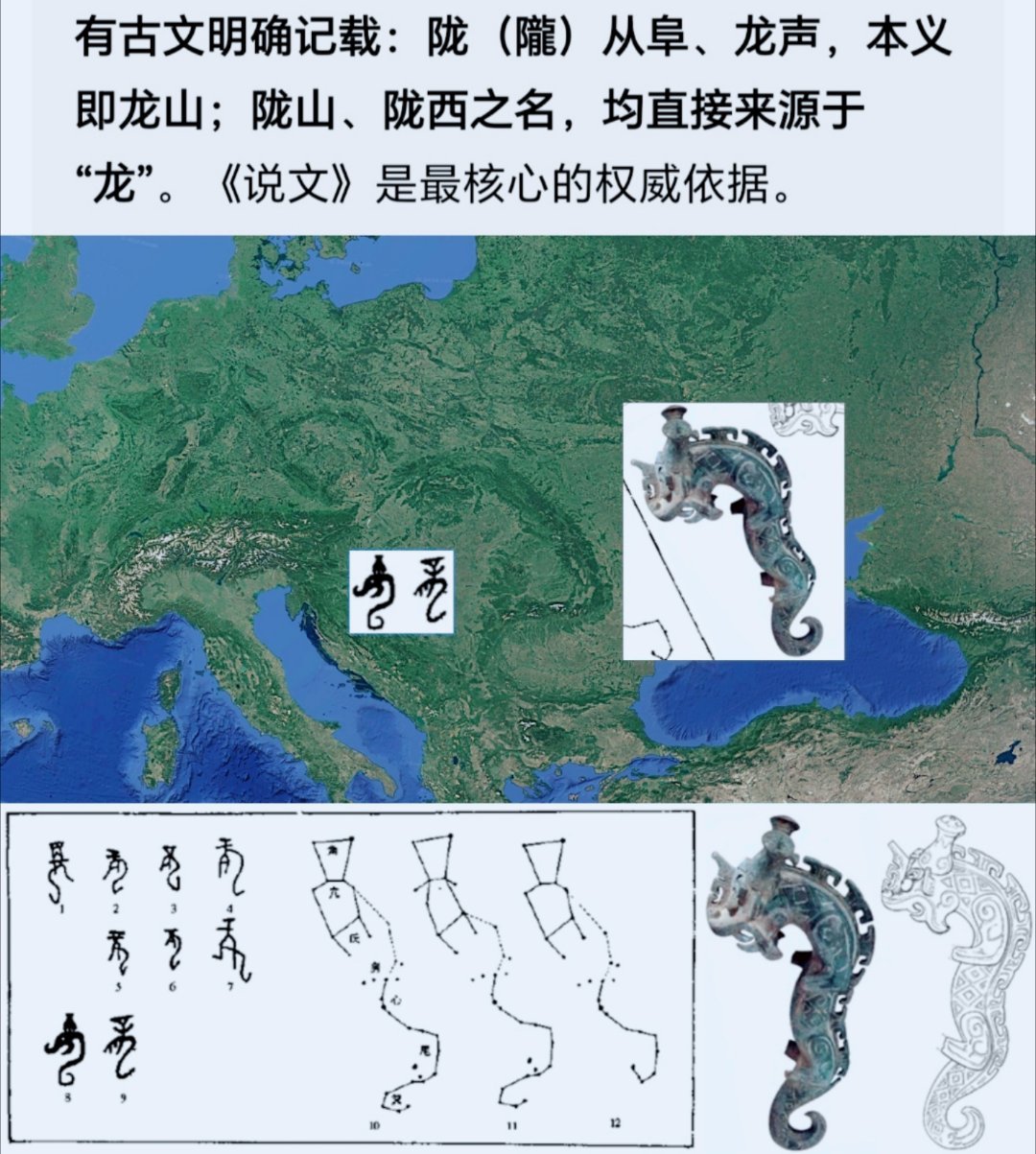 看来“龍”字是一个集天象,集地形而来的文字。在天成像,在地成形,一开始龙字就是苍龙七宿而来,喀尔巴阡山因为长得像这条苍龙,所以又叫龙山,所谓在地成型。后来是秦突破阿尔卑斯山防线拿下左边部首,于是龙字就变成了两地组合而来的形=“龍”?特别是秦小篆下部分和这地形简直一模一样。