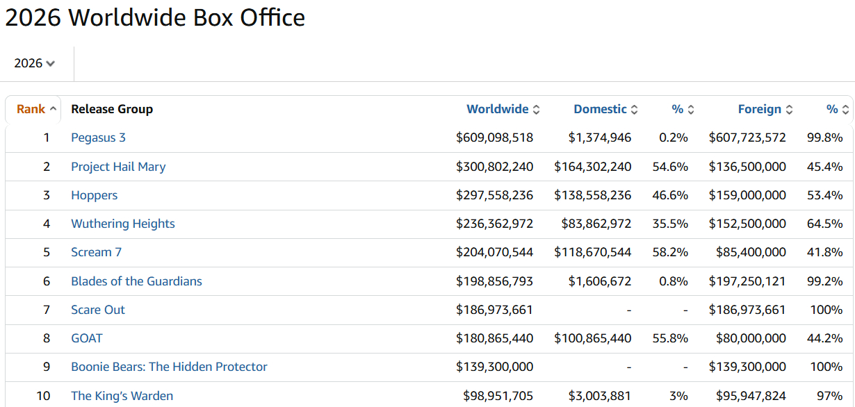 刚刚这个周末过去后北美票房就已经超中国了,不是别人强是我们今年太拉,往年都要四五月份才被超,今年北美淡季的水平就给超越了。不过目前年冠还是中国电影,全球前十有四部中国电影,韩国也凭一己之力进了一部,还是赢的