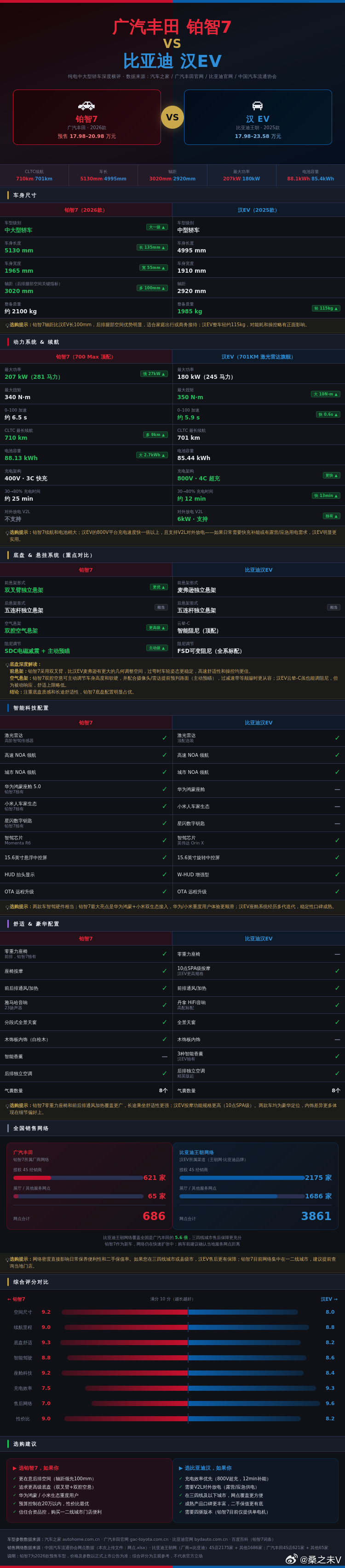 广汽丰田铂智7上市后,首当其冲的竞品便是同省车企比亚迪汉,一张图直观呈现两款车型的核心优势差异。