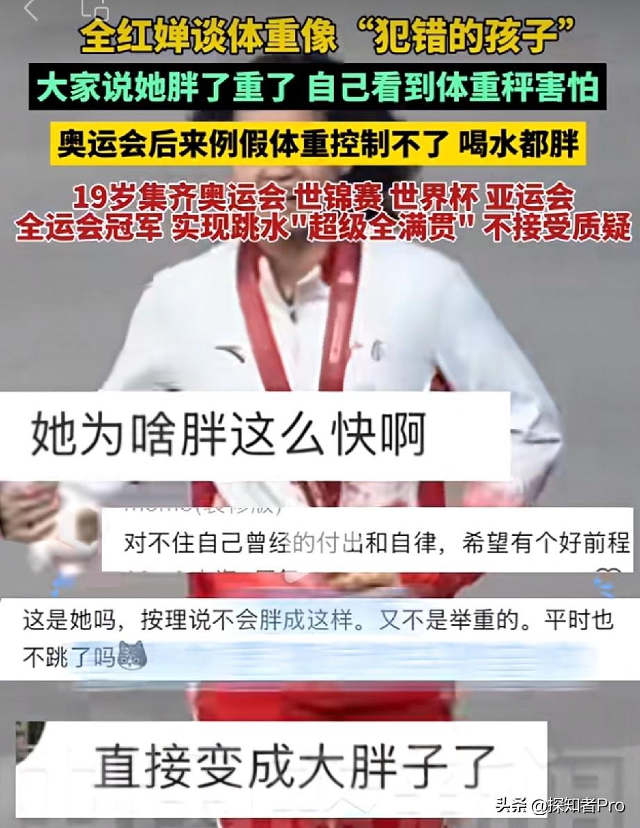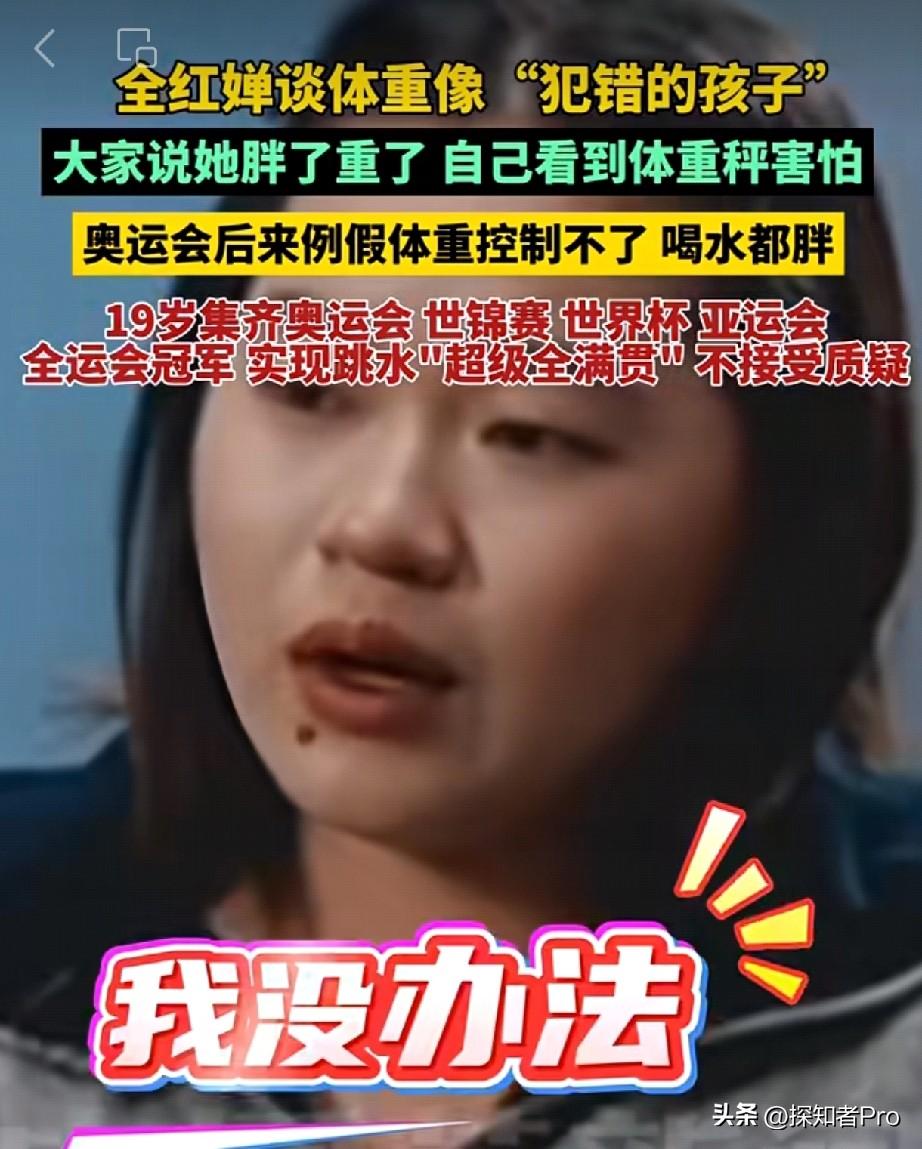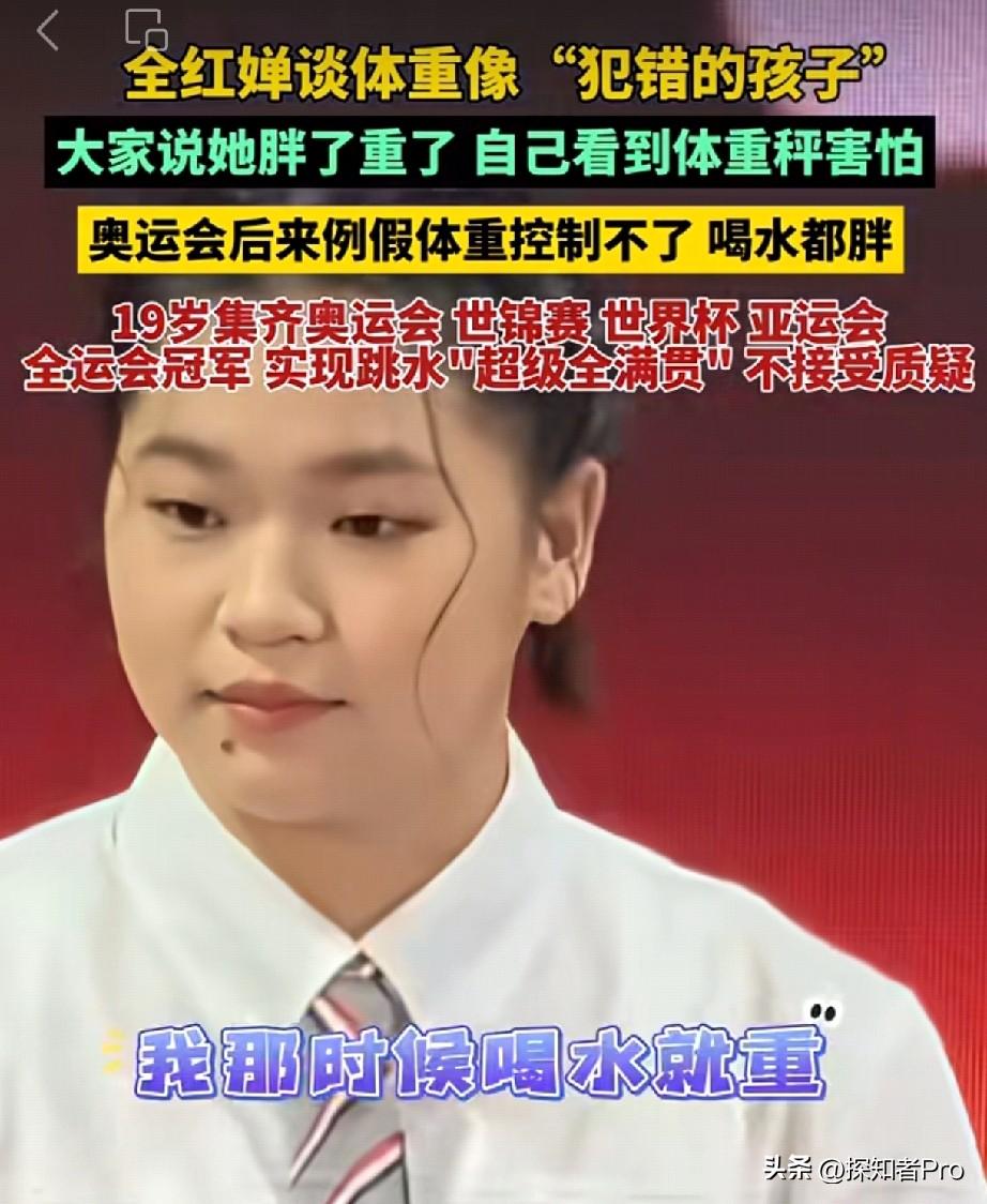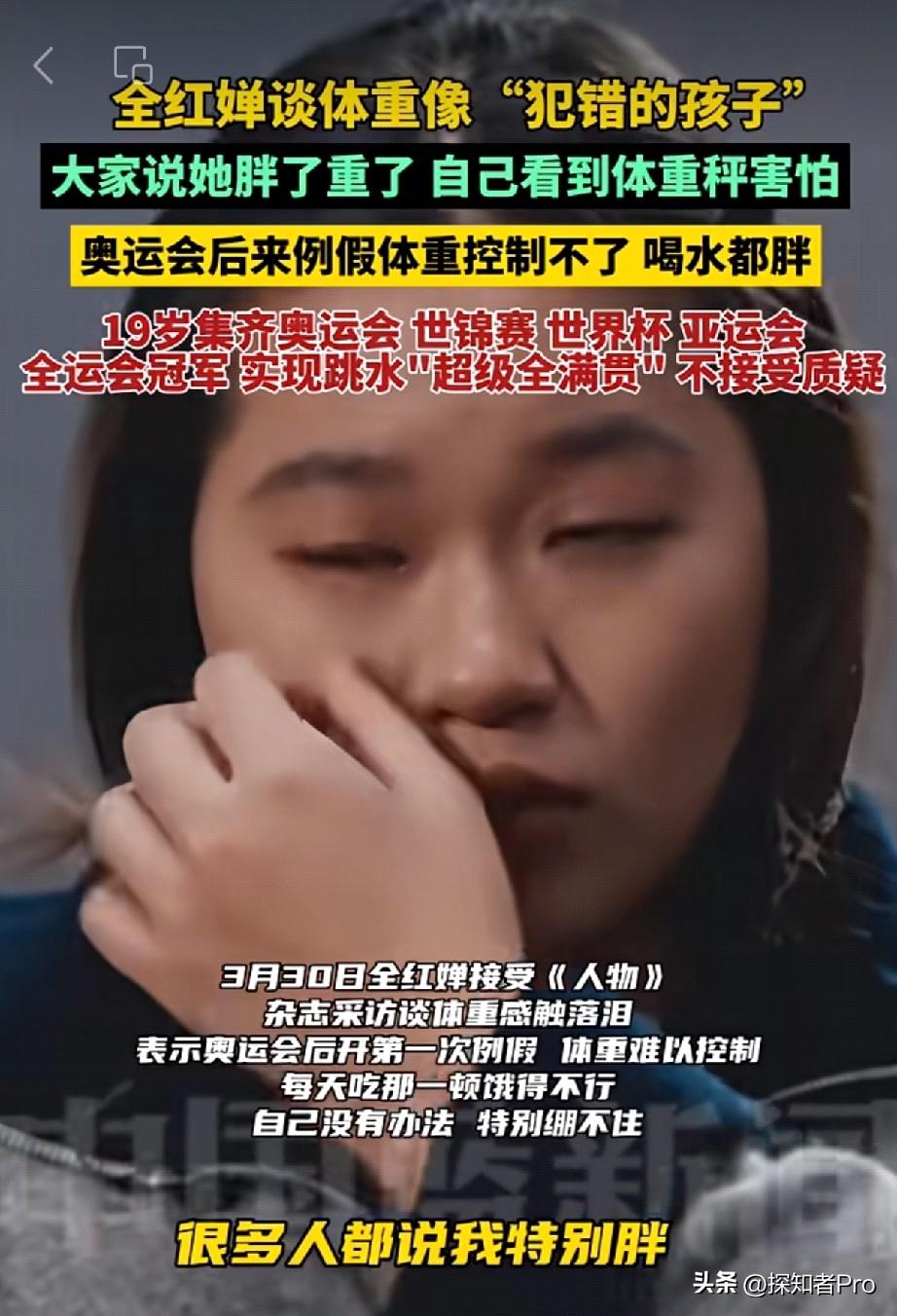 全红婵 委屈到哭了 在镜头面前流泪委屈说:“很多人都说我胖,特别伤心。那我也没办法呀,每天只吃一顿,饿到不行,但喝水也胖,我也怕胖呀,每天自己照镜子,也特别讨厌胖!” 所以别再说全红婵胖了,她也不容易呀,也是一个喜欢有苗条漂亮身材的普通小女孩呀,可是她又有什么办法呢? 要知道,一个运动员出身的人,绝对是自律到极致的人,曾经每天的高强度训练,没有极致的自律,是不可能完成,也不可能走得这么稳这么远的! 现在她是胖了。可是,她也是普通人,她也是个爱美的小女孩,也想把最美的自己展现在大众面前,也在为控制身材努力、自律,但是体质如此,她也是没有办法的事。 其实,最美的不在于外表,更不在于身材的胖瘦,而是那颗保持善良、纯真的心灵和最真实的自己,没有必要为了迎合他人的审美而去刻意改变。 全红婵别哭,网友也不在乎你胖与瘦,在乎的是人品和你自信“轻松拿捏”的样子。你永远是网友心中最美的冠军女孩! 也相信,全红婵能通过努力和自律,管理好自己的身材和健康! 加油,美丽勇敢的女孩!💪💪