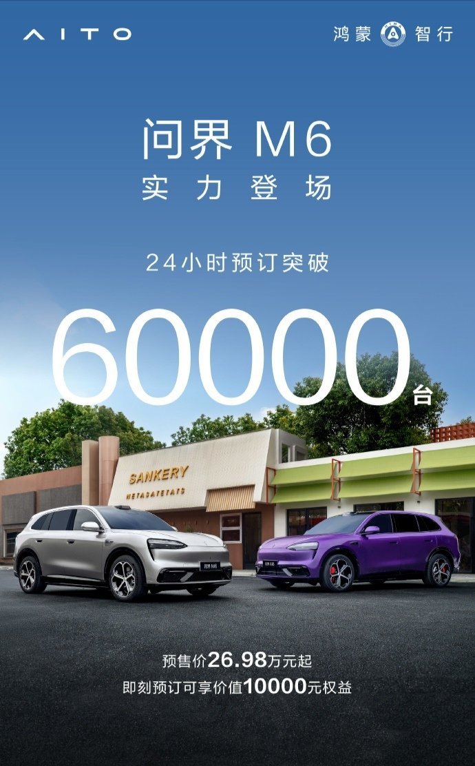 华为余承东 3 月 24 日在微博发文称,鸿蒙智行“新锐智慧 SUV”问界 M6 汽车 24 小时订单突破 60000 台。