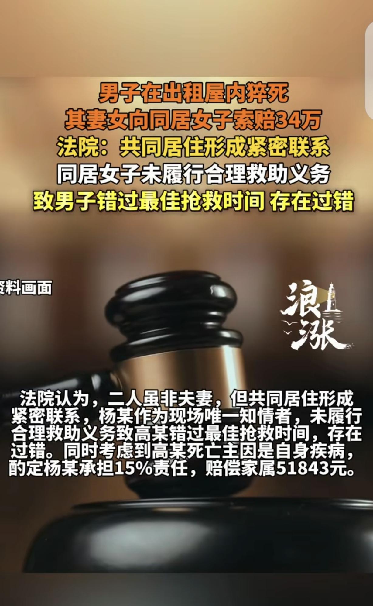 “自食恶果!”湖北,一男子和情人租房同居,半夜突发心梗晕倒,情人竟然40分钟后才跟房东求助,可男子错过黄金抢救时间死亡,妻女一怒之下,把第三者告上法庭,索赔34万。情人:他病死的,跟我有啥关系?法院判决让人太解气了。 高某和杨某这对情人,为了避开熟人圈子,出双入对,同床共枕,他们在外面租了一间民房同居。 本来是想躲着家里人,过两人的温存日子,谁能想到,这租来的房子最后成了高某的生命终点。 出事那天是2025年4月27日半夜,高某在睡梦中,突然觉得胸口像被大石头压住了一样,紧接着就是一阵钻心的疼。 他挣扎着想坐起来,结果还没翻个身就重重倒在床上,冷汗瞬间湿透了枕头。 这就是典型的心梗发作,在医学上,这时候的每一秒钟,都是在跟死神抢人。 可守在他身边的杨某,表现得实在让人脊背发凉。 高某倒下后,杨某并不是第一时间拿起手机拨打120,也没有尝试任何急救措施,更没有向邻居呼救。 她就那么眼睁睁地看着高某在床上痛苦地抽搐、失禁,直到最后连呼吸都变得微弱。 整整40分钟,杨某在屋里反复踱步,不知道是在害怕背负骂名,还是在担心承担责任。 直到高某完全没了动静,她才慌慌慌张地跑下楼去敲房东的门。 等房东儿子打了120,救护车赶到时,高某早已经错过了最关键的“黄金六分钟”。 医生赶到现场一检查,人已经凉了,瞳孔都散了,神仙下凡也救不回来。 妻女接到死讯时,天都塌了。她们怎么也没想到,家里支柱就这么不明不白地死在了出租屋里。 等到办完丧事,了解清楚当晚的细节后,妻女俩的悲痛直接变成了愤怒。 她们发现,高某虽然有基础病,但如果在40分钟里有人能帮一把,绝对不至于没命。 于是,她们把杨某告上了法庭,要求赔偿34万。 法庭上,杨某还觉得委屈,辩解说高某是自己病死的,又不是她害死的,她没拿刀也没下毒,凭什么让她赔钱? 她甚至觉得,自己最后去找房东求救,已经算是尽了情分。 但法官认为,两人虽然是非法同居关系,但在那种封闭的居住环境下,双方已经形成了一种事实上的救助义务。 高某突发恶疾,杨某作为唯一的在场人,有责任也有义务第一时间呼救。那消失的40分钟,就是导致高某死亡的直接推手。这种冷漠,已经构成了法律上的过失。 这事儿真是让人唏嘘。高某放着好好的日子不过,非要和情人同居,结果落得个猝死出租屋的结局,也算是自食恶果。 但杨某的做法更让人心寒,同居期间,面对突发疾病的高某,她竟能冷眼旁观40分钟,这哪还有半点人性? 法律判她担责,真是大快人心。这也给那些搞婚外情的人提了个醒,别以为能躲过道德谴责就万事大吉,法律也不会放过那些冷漠无情、见死不救的人。 《民法典》第1165条规定,行为人因过错侵害他人民事权益造成损害的,应当承担侵权责任。 本案中,杨某与高某同居,高某突发心梗时,杨某作为唯一在场人,有救助义务却未及时呼救,存在过错,导致高某错过抢救时间死亡,杨某应承担侵权责任,法院判决合理合法。 最后,法院判决杨某承担50%的责任,赔偿家属5万多元。 虽然钱不多,但这股正气立住了。这种判决就是要告诉那些人:哪怕是见不得光的关系,在生命面前,法律也绝不容许冷眼旁观。 对此,你怎么看?