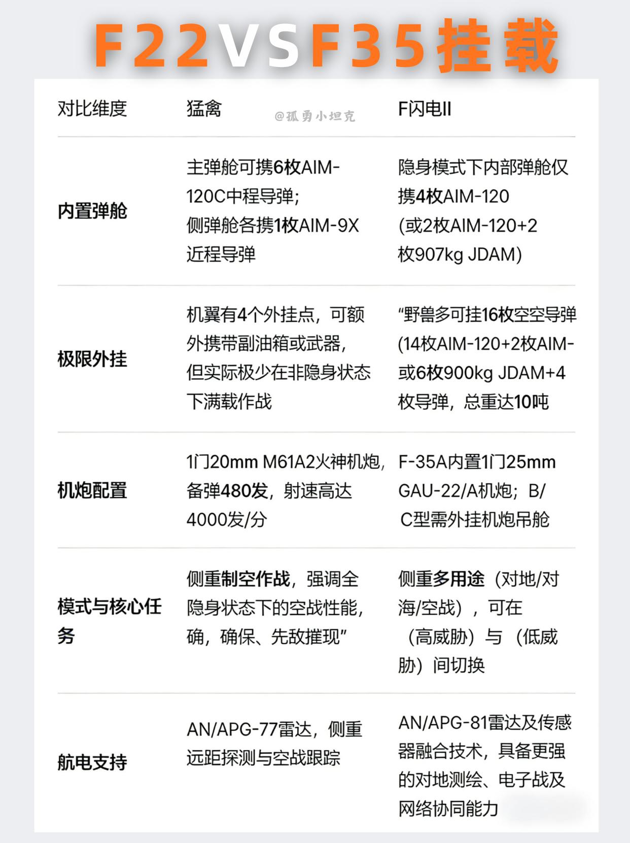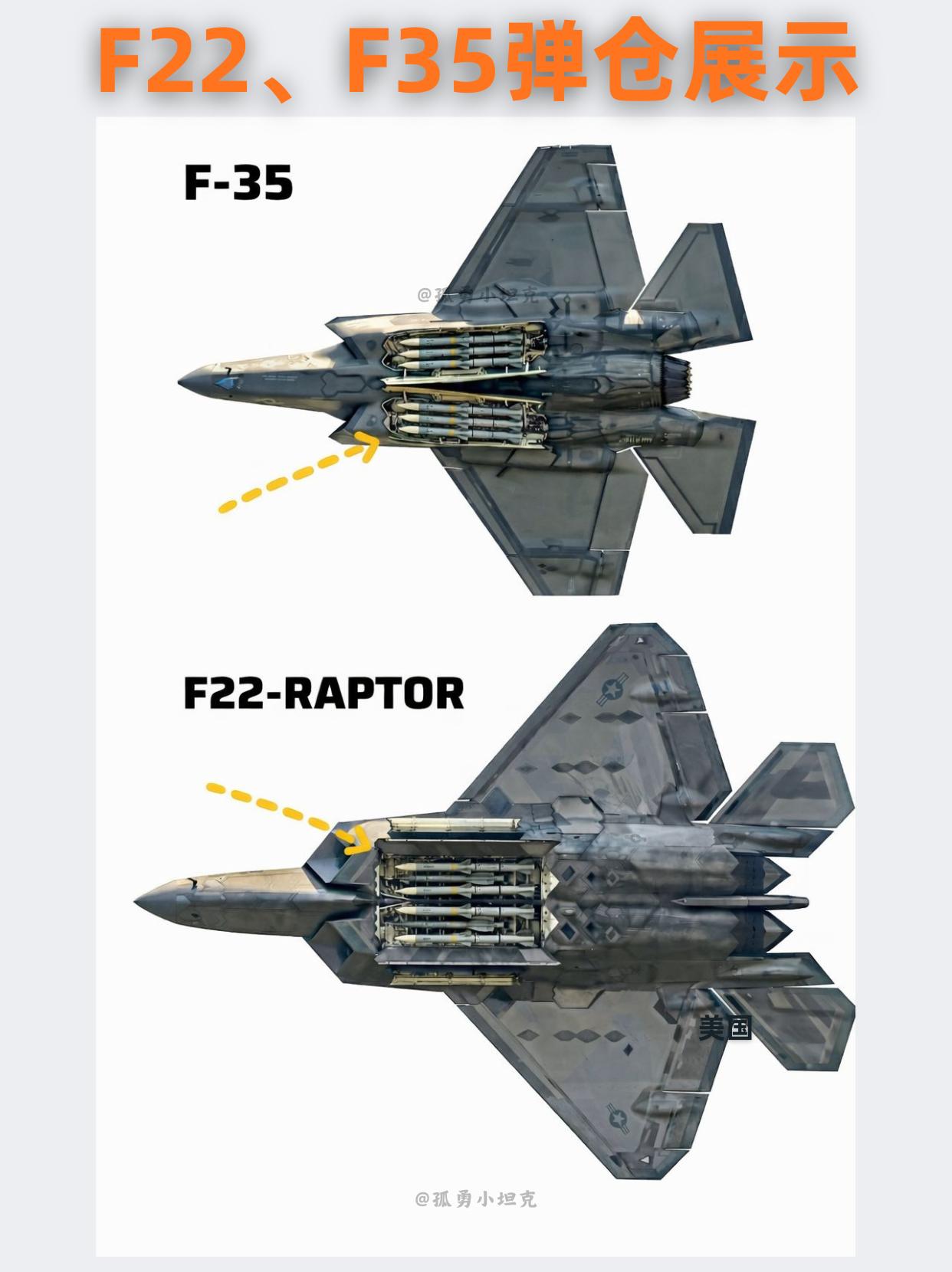全能挂载的 F35,制空真不如老款 F22? 两款五代隐身战机是美军空中作战的核心支柱。 1、F22 主打纯制空作战,主弹舱可携 6 枚 AIM-120C 中距弹,侧弹舱各配 1 枚格斗弹,隐身状态下制空火力拉满,航电侧重远程空战探测。 2、F35 侧重多用途作战,隐身模式弹舱可携 4 枚中距弹或对地弹药,极限外挂弹药总重可达 10 吨,航电强化对地测绘与网络协同能力。 二者定位互补,构成美军五代机核心作战体系。