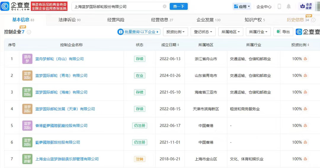 企查查APP显示,上海蓝梦国际邮轮股份有限公司成立于2016年8月,法定代表人为林恩杰,注册资本7711.03万元,现由福建中运投资集团有限责任公司、青岛聚融产业投资有限公司、舟山群岛国际邮轮港有限公司共同持股。蓝梦邮轮共有7家控制企业,包括蓝舟梦邮轮(舟山)有限公司、蓝梦国际邮轮(青岛)有限公司等。