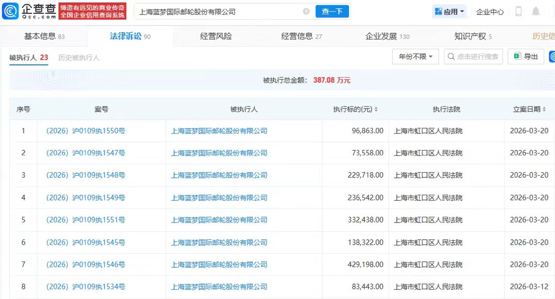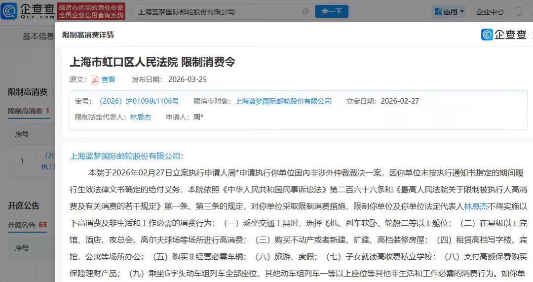 企查查风险信息显示,蓝梦邮轮已多次被列为被执行人。此外,因未按执行通知书指定的期间履行生效法律文书确定的给付义务,蓝梦邮轮及法定代表人被限制高消费。(大皖新闻)