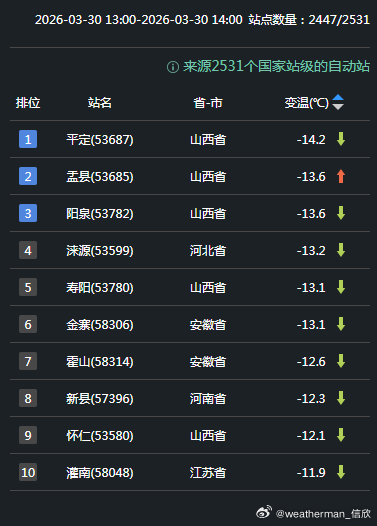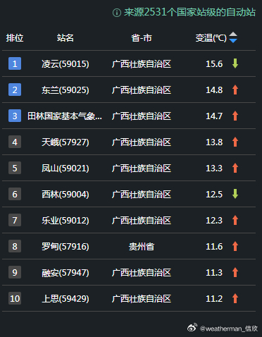 【气温波动】今天因为天空放晴,广西贵州多地升温超10℃,广西凌云升15.6℃、东兰升14.8℃、田林升14.7℃、天峨升13.8℃、凤山升13.3℃,排在14时升温榜前五。今天因为冷空气影响,华北到黄淮江淮等地出现4-12℃降温,部分站点降温更强。山西平定降14.2℃、河北涞源降13.2℃、安徽金寨降13.1℃、河南新县降12.3℃、江苏灌南降11.9℃,为各自省份14时降温最强站点。