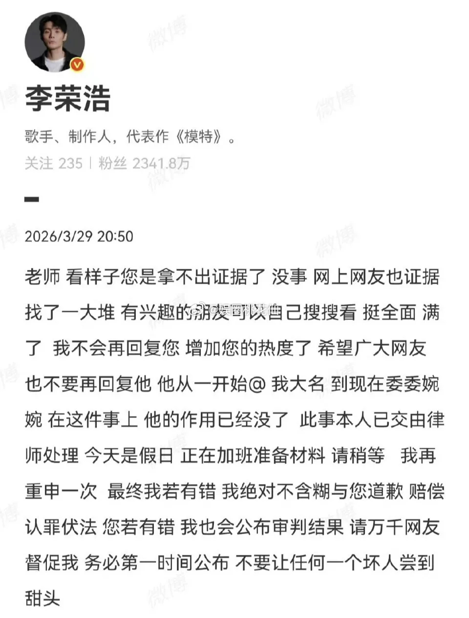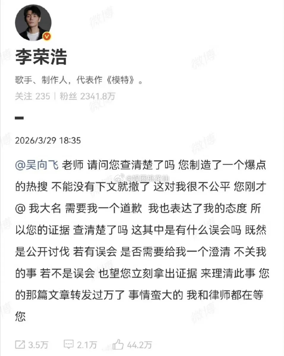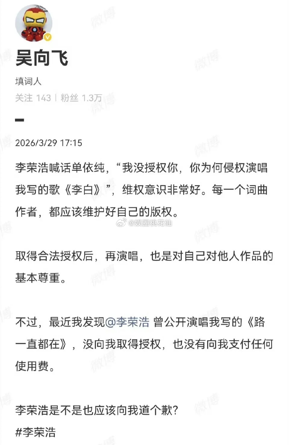 吴向飞喊话李荣浩称其侵权,这番逻辑让人有些摸不着头脑。李荣浩一直要求他拿出证据,表示若属实会公开道歉并赔偿,可吴向飞却反复强调21年后打官司的事,听起来实在有些驴唇不对马嘴。既然吴向飞认为李荣浩侵权,按常理应该是他向李荣浩发起法律诉讼才对,怎么反倒成了“如果李荣浩要打官司,他奉陪到底”?闹到最后,吴向飞拿不出实质性证据,反倒像是担心李荣浩告他诽谤,说着说着便表示不再回复。这一连串操作下来,难免让人猜测,吴向飞是不是出来转移视线、帮单依纯减轻舆论压力的?毕竟眼下的焦点,本就不在这桩陈年旧事上。
