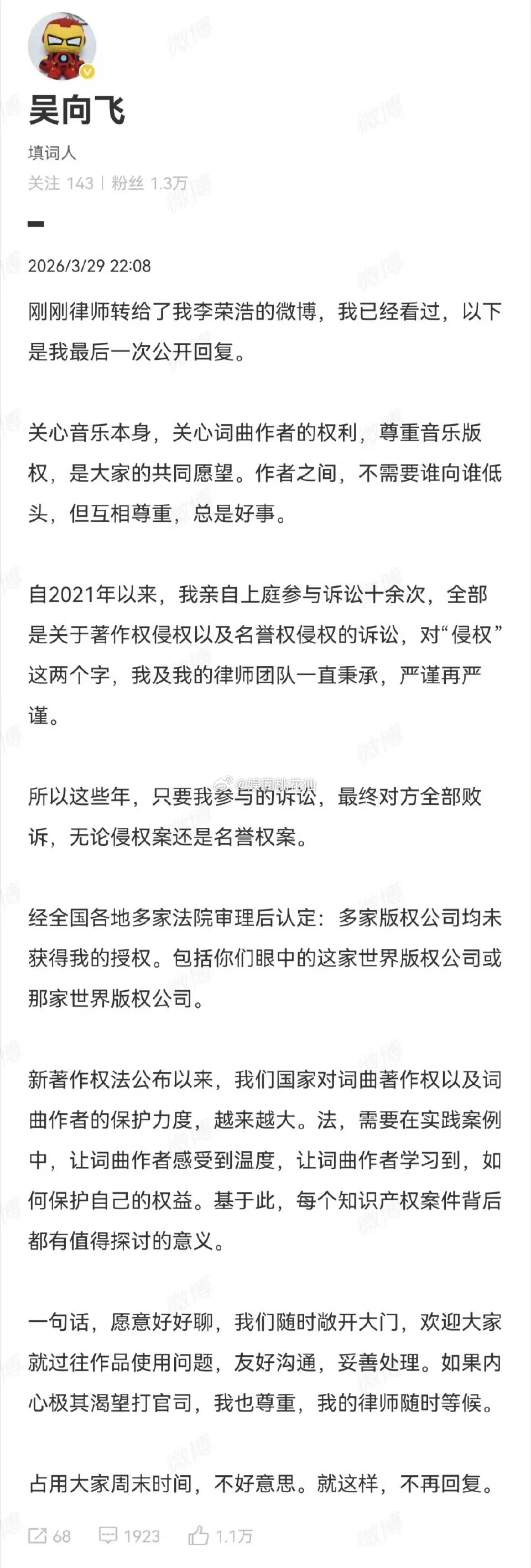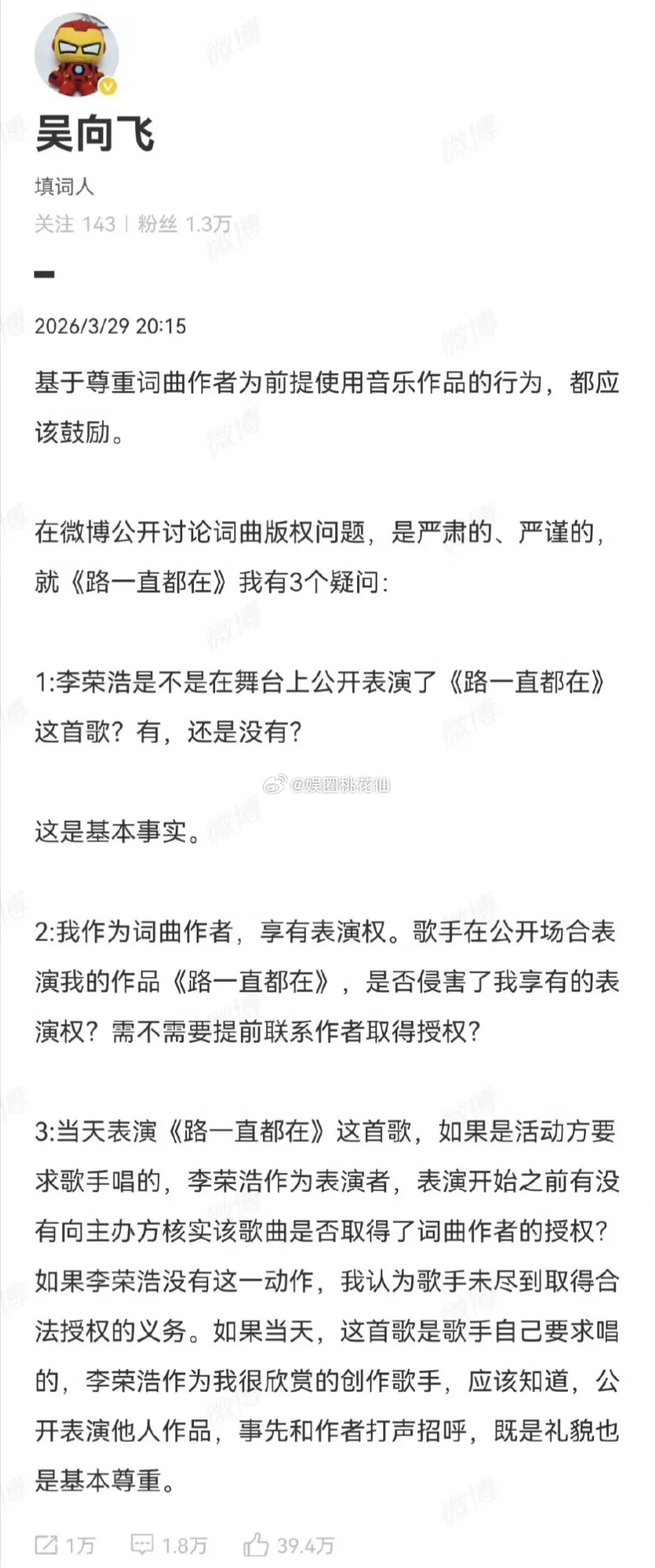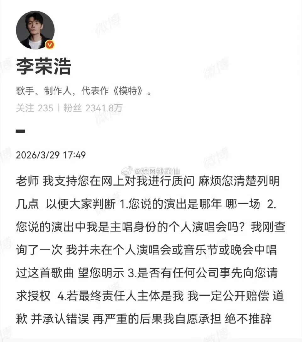 吴向飞喊话李荣浩称其侵权,这番逻辑让人有些摸不着头脑。李荣浩一直要求他拿出证据,表示若属实会公开道歉并赔偿,可吴向飞却反复强调21年后打官司的事,听起来实在有些驴唇不对马嘴。既然吴向飞认为李荣浩侵权,按常理应该是他向李荣浩发起法律诉讼才对,怎么反倒成了“如果李荣浩要打官司,他奉陪到底”?闹到最后,吴向飞拿不出实质性证据,反倒像是担心李荣浩告他诽谤,说着说着便表示不再回复。这一连串操作下来,难免让人猜测,吴向飞是不是出来转移视线、帮单依纯减轻舆论压力的?毕竟眼下的焦点,本就不在这桩陈年旧事上。
