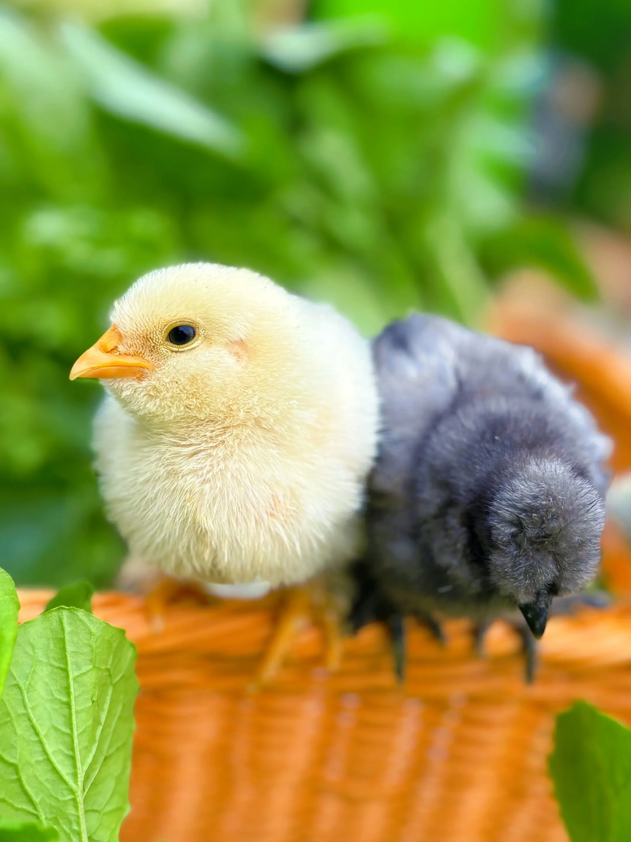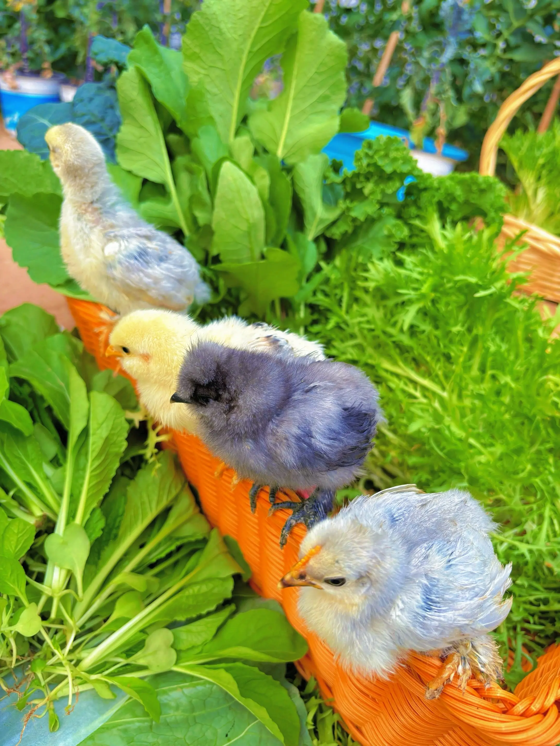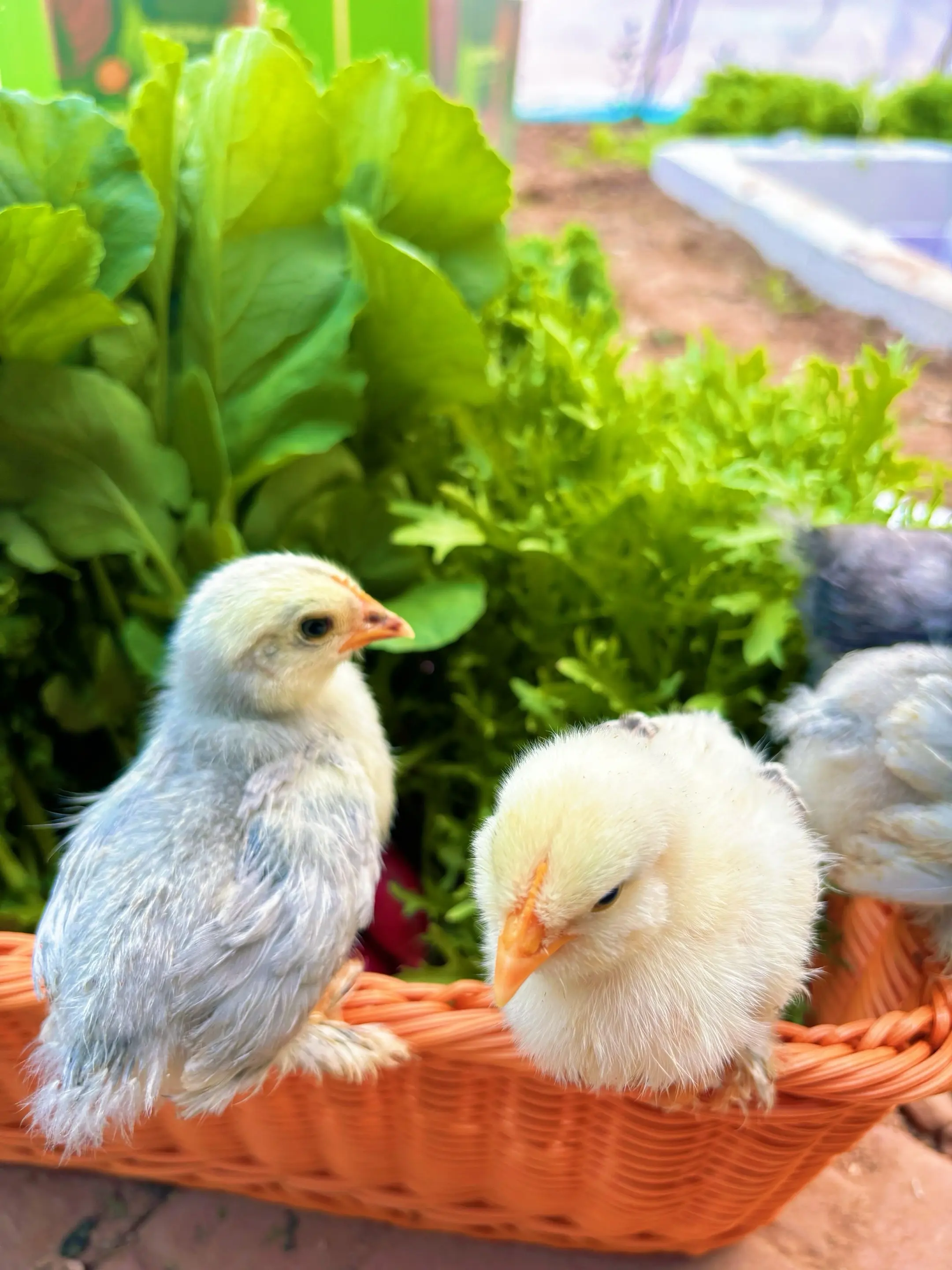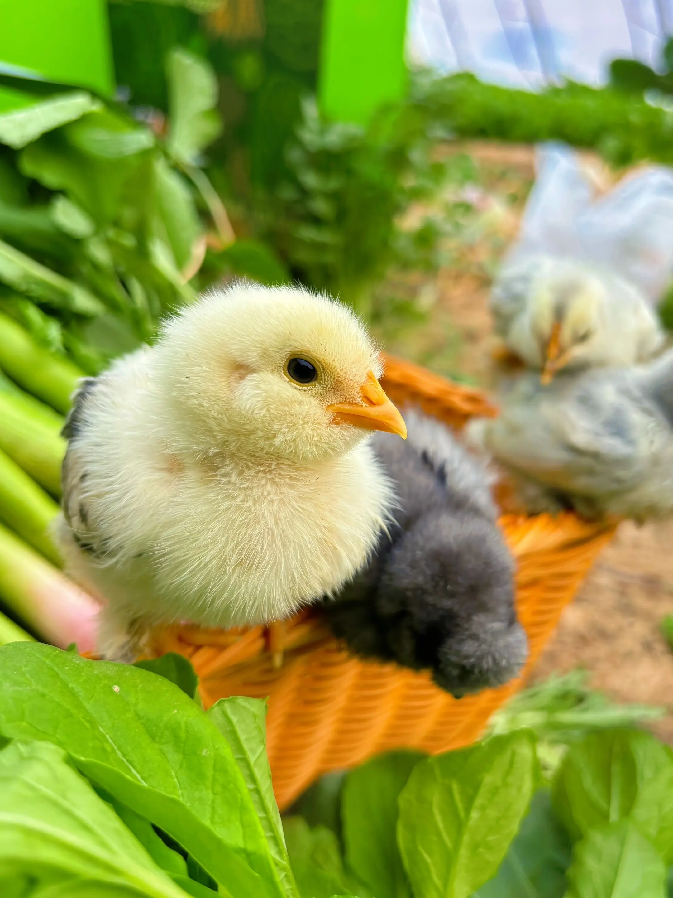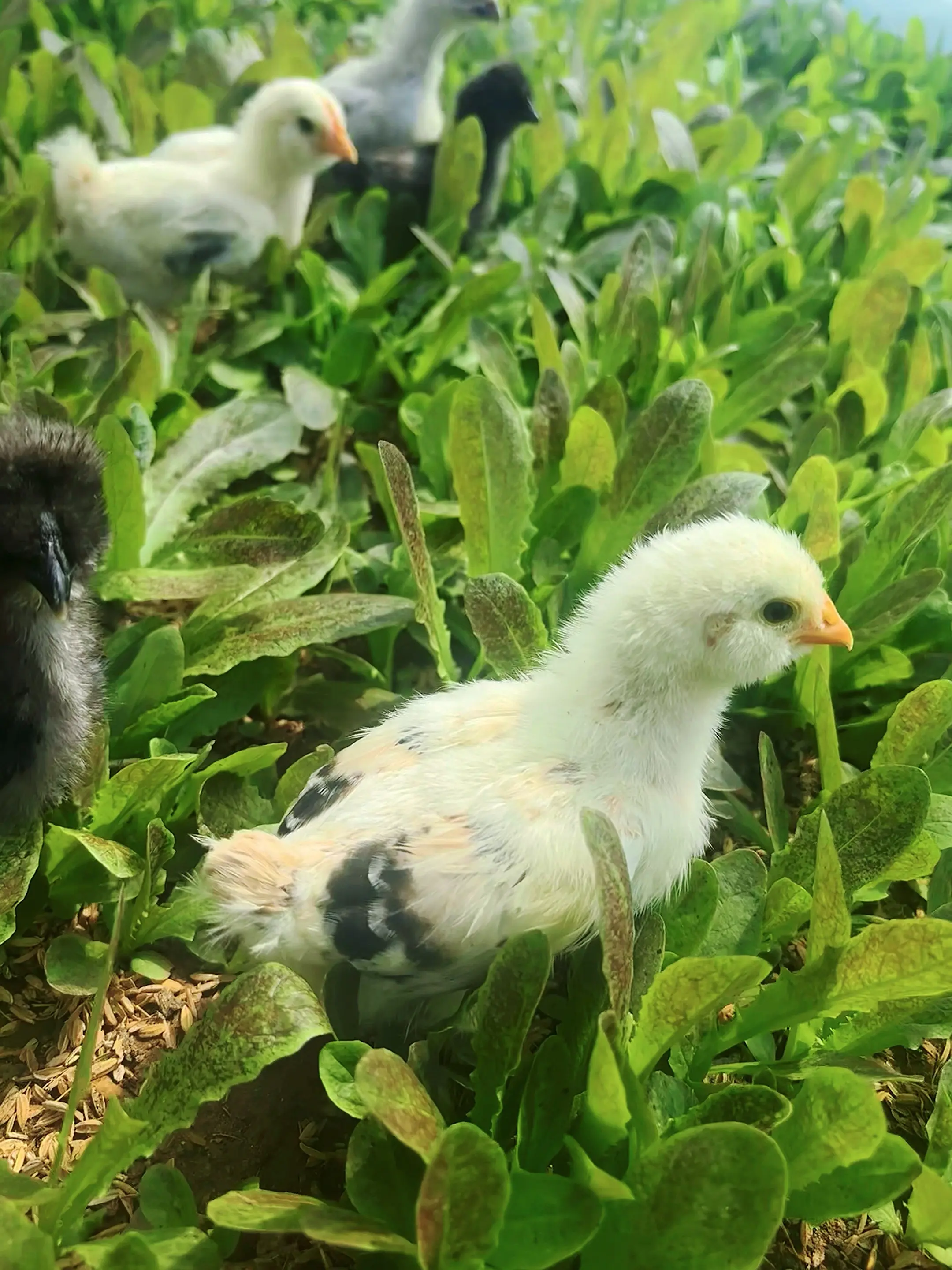 春天向上的生命力,有机有鸡。一切都是向上生长的生命力,向上生长的有机蔬菜,向上生长的小鸡,有希尔鸡,科钦球鸡,小体法芙洛鸡