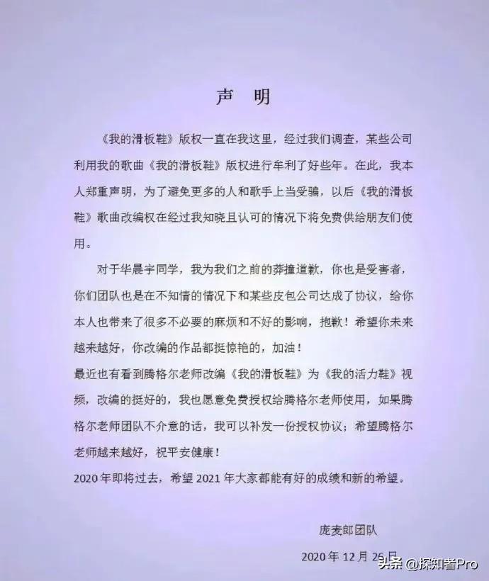 庞麦郎 艾特 华晨宇 转发李荣浩维权《李白》,内涵《滑板鞋》版权 华晨宇霸气回应:懒得理你,一句都不再回应... 随后,华晨宇工作室晒出当年庞麦郎的道歉声明以及版权授权合法合规的证据,霸气配文8个字:冷饭又炒,不再回应! 要说庞麦郎也是个娱乐圈里的奇葩,各种迷惑操作,总是出人意料,这次想借着李荣浩维权《李白》的热度,顺便翻炒一下《滑板鞋》的热度,蹭点“花花”的流量,未曾想让“花花”一句话霸气回怼,流量热度计划完败😂 不过也有网友说:要是这两个人凑个组合,同台演唱,绝对是天作之合,惊艳舞台!流量绝对是顶级! 只是,赚流量没错,也得有个正能量的方式和底线,不能为了流量而去牺牲他人的声誉! (信息来源:微博)