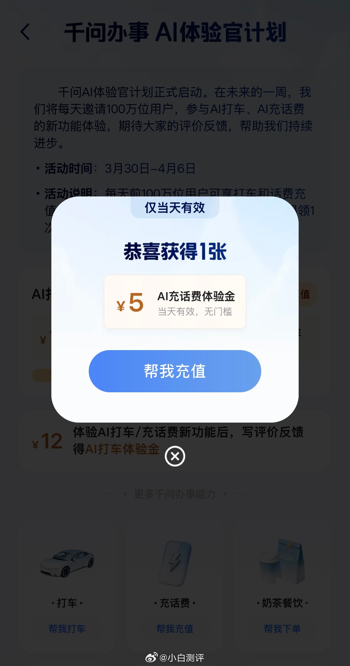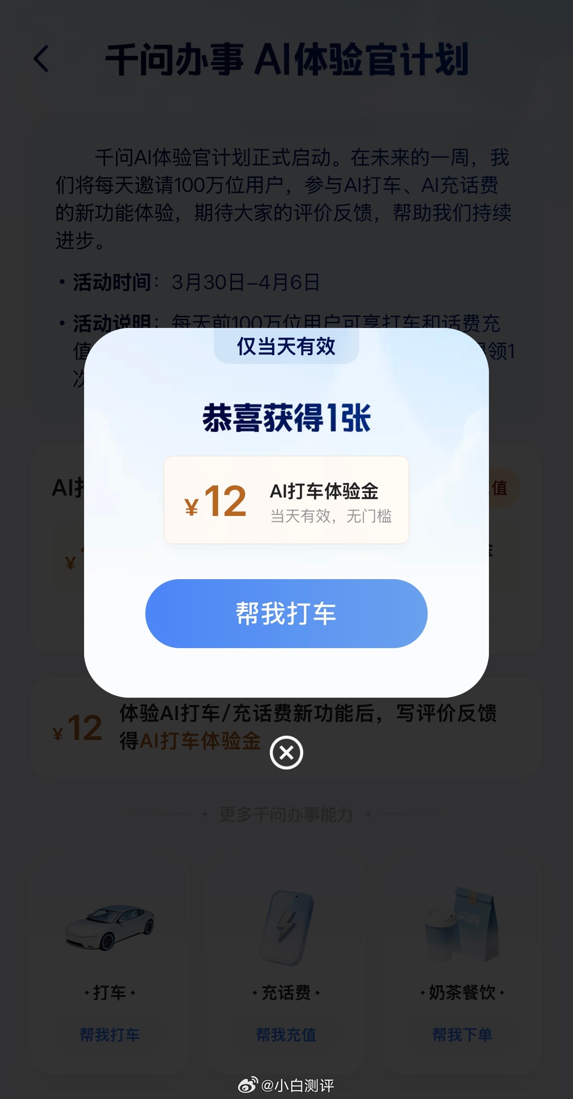 太久没用千问了,今天刷到有活动立马打开,一张12块钱打车券,一张50-5话费券,