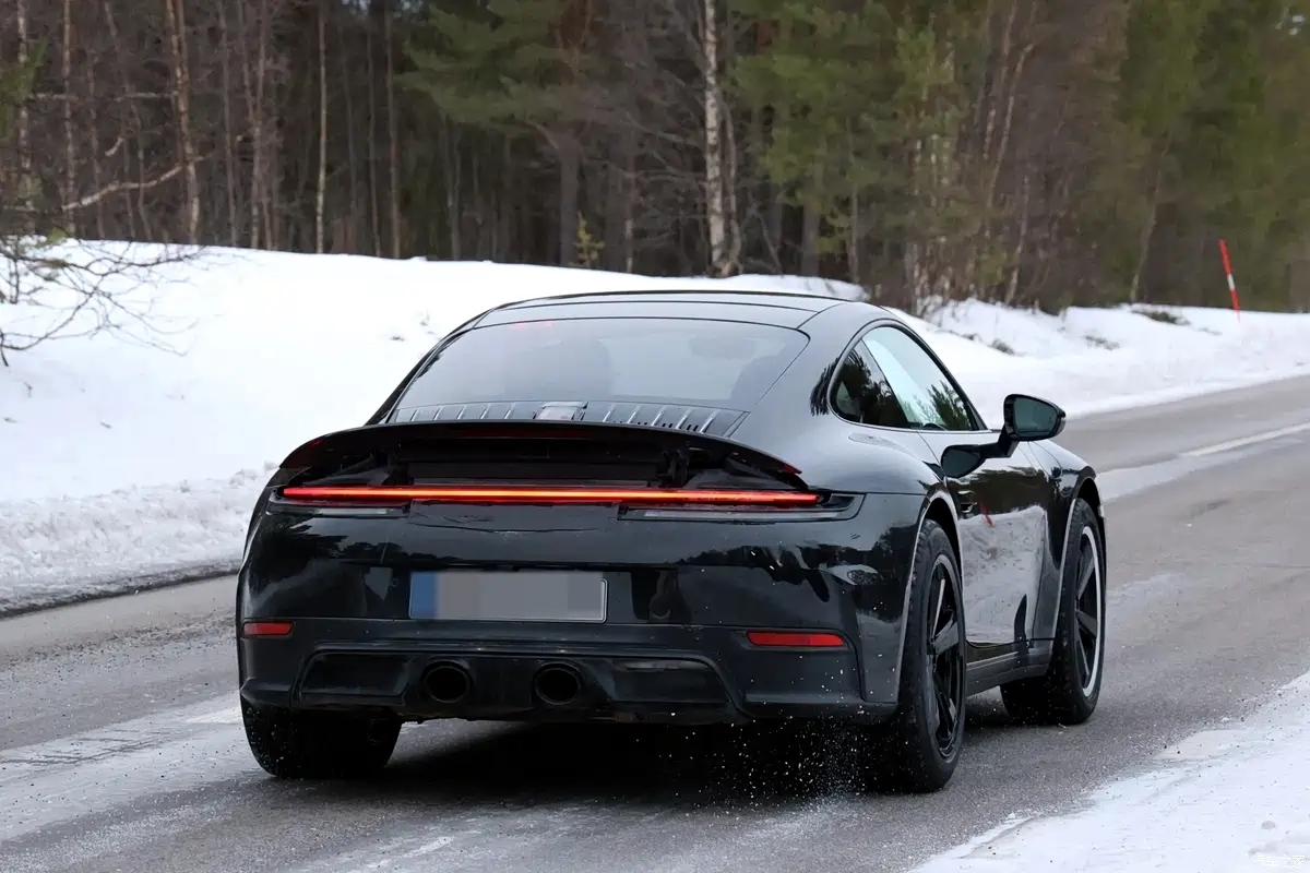 外观,前脸用992.2代扁平款矩阵式LED大灯,转向灯融到灯组。前包围加了高强度铝合金护板,两侧大进气口确保高效散热。 侧面,预计轮拱加宽,为了全地形轮胎,底盘预计能抬高50mm,极限模式离地间隙可能有80mm。