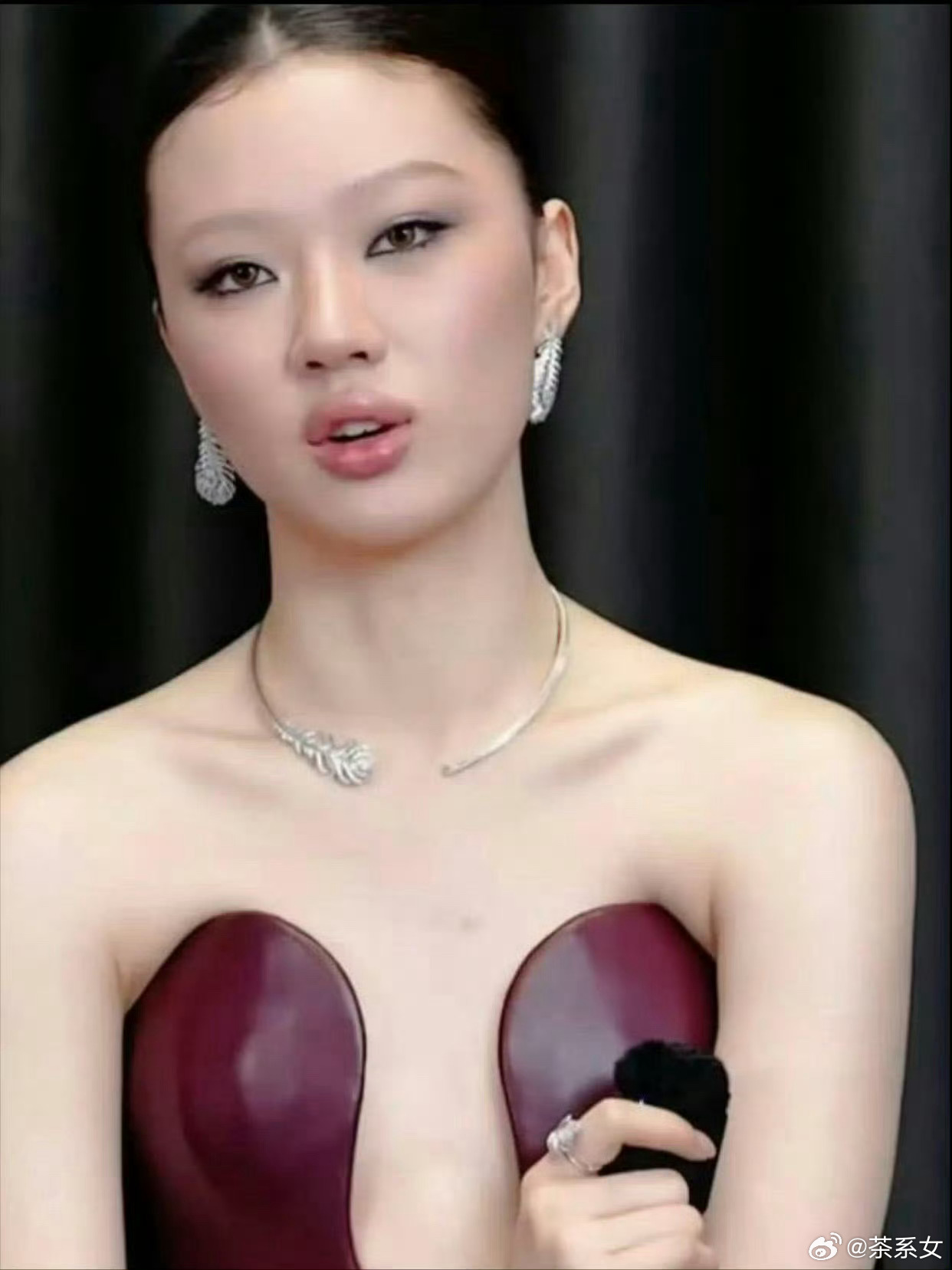 单依纯这礼服设计好特别,酒红色抹胸像两片猪肝。