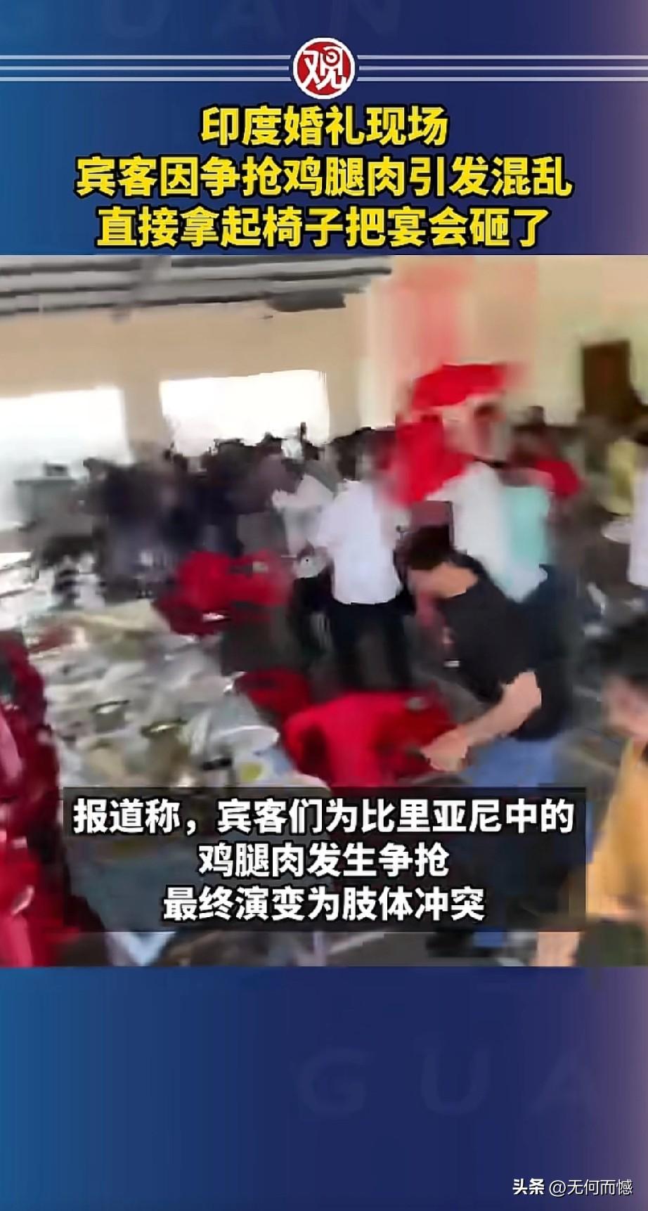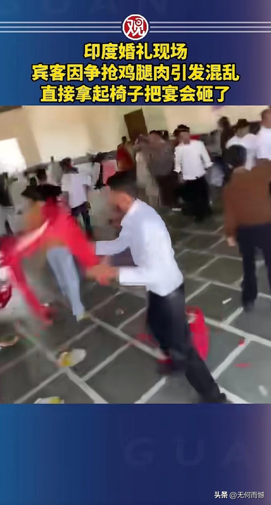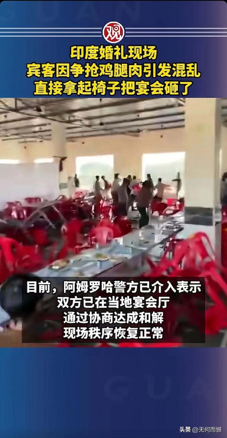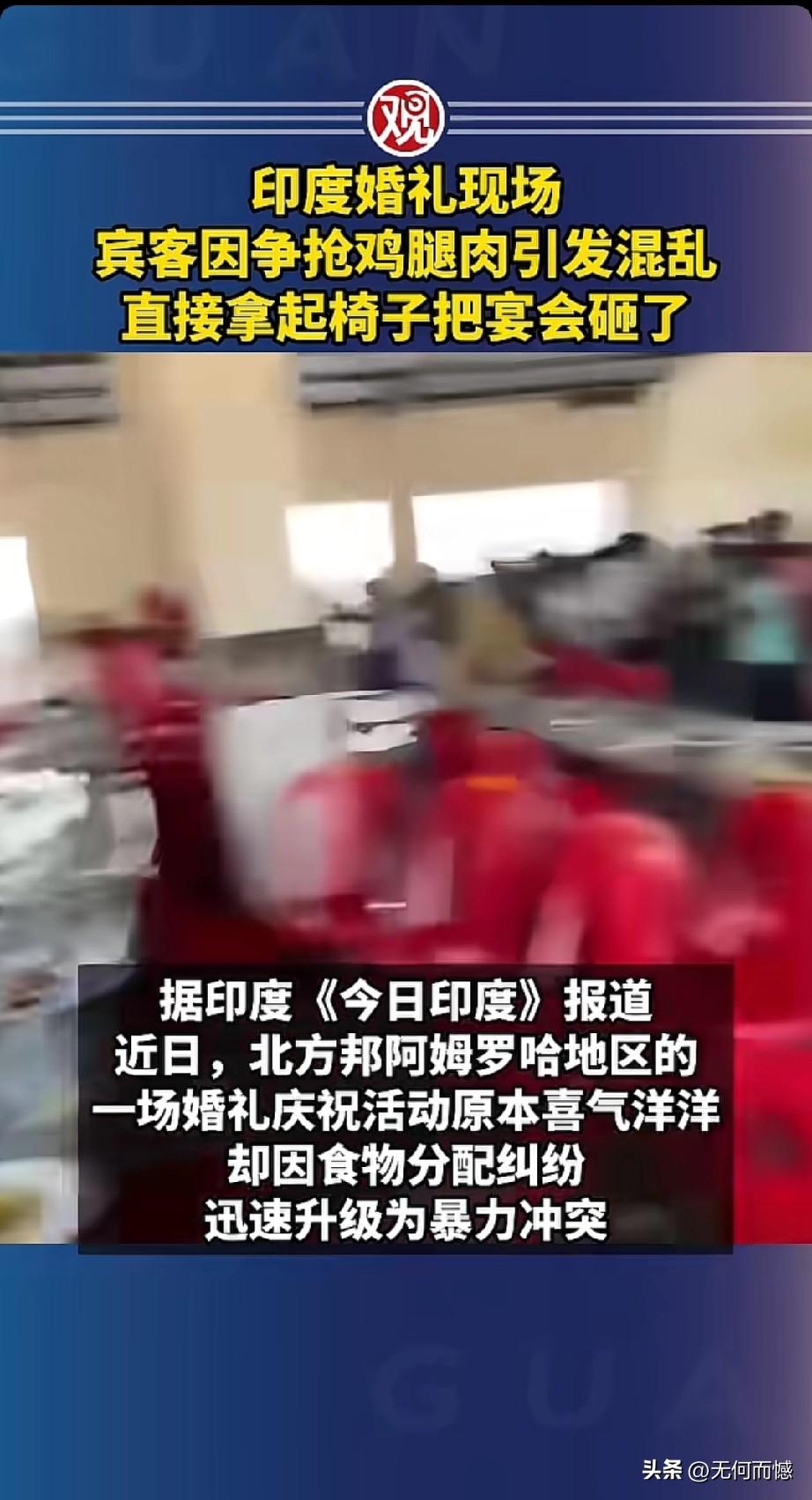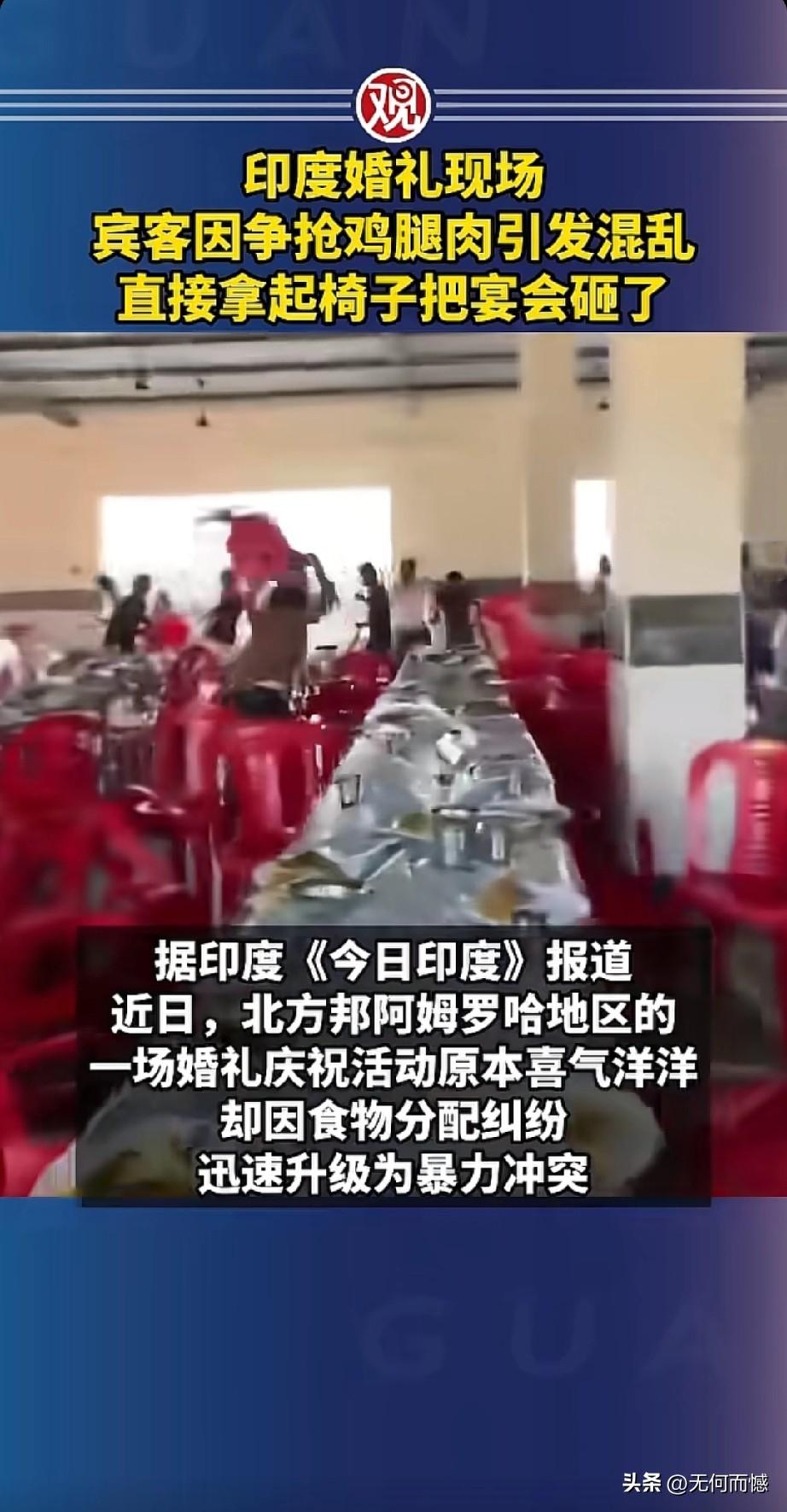 为了一口鸡腿干翻婚礼?印度这席子整得太虎了!要说啥叫“为了吃不要命”,印度这场婚礼算是给咱整明白了! 据《今日印度》报道,北方邦阿姆罗哈一场喜酒,本来热热闹闹,结果就为了比里亚尼饭里那几块鸡腿肉,宾客们直接干翻了天。你想啊,那鸡腿炖得油光锃亮,谁瞅着不眼馋?结果分饭的时候没匀明白,有人急眼了,抄起红塑料椅子就往桌上砸,哐哐一顿造,好好的宴会厅秒变战场。 你瞅瞅那现场,椅子倒一片,饭菜撒一地,本来要吃席的人,直接改成“干仗局”了。这阵仗,比咱东北人抢着买单还虎!毕竟在印度,这比里亚尼可是庆典硬菜,鸡腿肉更是精华中的精华,抢不着那不得急眼? 好在最后警方介入,两边在宴会厅唠明白和解了,没闹出更大乱子。只能说,这哪是婚礼啊,这分明是“鸡腿引发的血案”现场版!