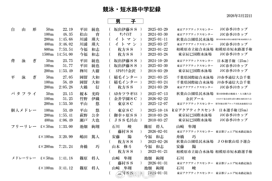 日本JOC春季水泳競技大会 男200混15-16岁年龄组决赛平山悠 1:54.38 日本中学纪录