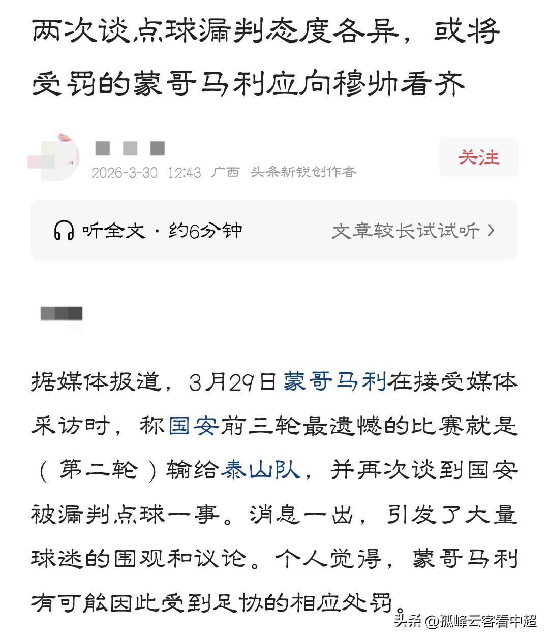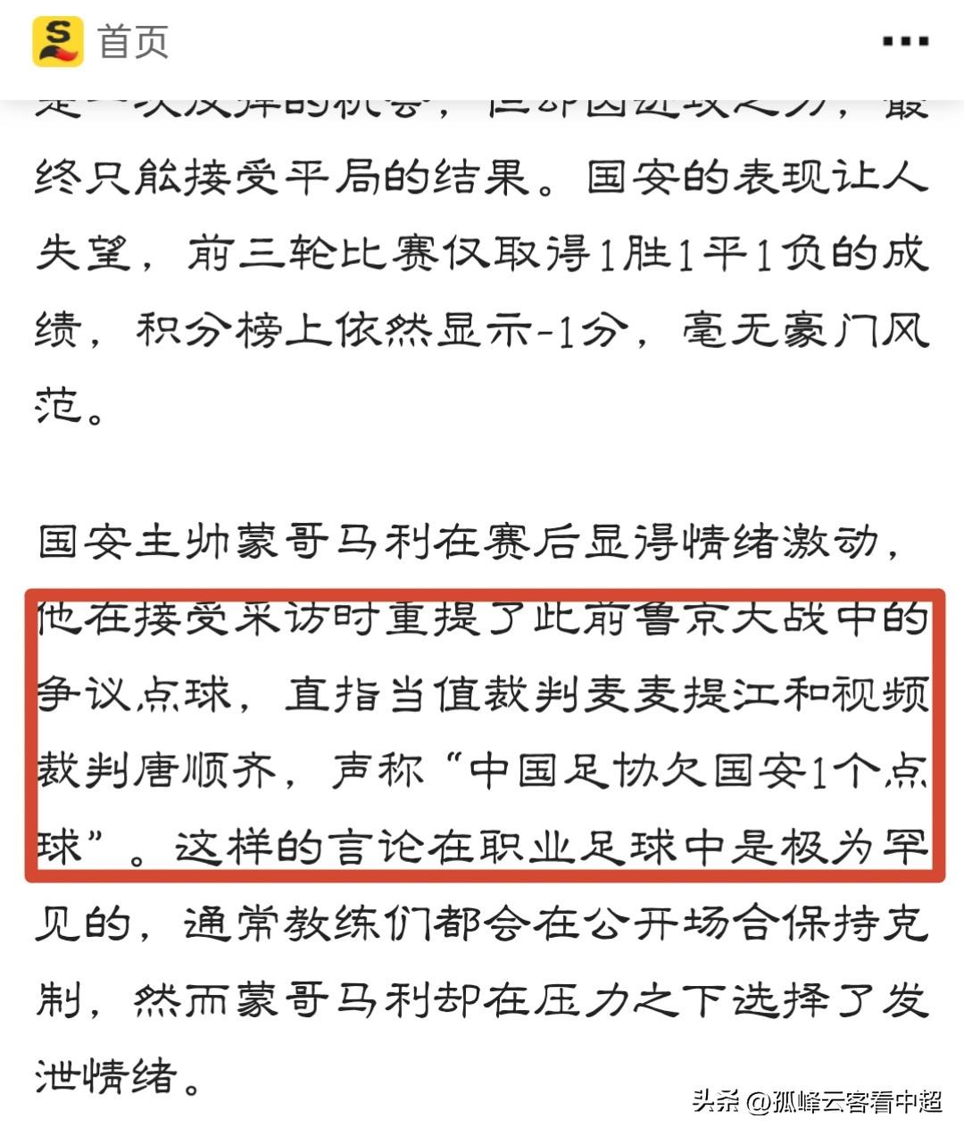 蒙哥马利实话实说,竟然有人担心他会被足协惩罚! 昨天北京国安举行公开训练课,球队主教练蒙哥马利接受了京媒“天天体育”的采访,当中就谈到联赛第二轮客场对阵泰山时被漏判的点球,因此也被一些球迷认为可能会触及足协的敏感神经,甚至由此会收到一张罚单。 不过小编在查看了蒙哥马利的原话后认为大可不必担忧,虽然他对此事表达了遗憾,但话语之间却是风轻云淡,并没有激烈的言辞,不过令人没想到的是在经过一夜发酵后,有些自媒体竟然用了“蒙哥马利称足协欠国安一个点球”来做噱头,这不是纯粹看热闹不嫌事大吗? 作为一个在足坛闯荡多年的教练员,蒙哥马利深谙足球规则,在既定事实无法改变的前提下,事情又过去了这么多天,他是不会无端无故再用这个事情来引发舆论关注的,要知道中国足协虽然在业务上能力一般,但在开具罚单上可是非常专业的,相信苏格兰人是不会主动去触这个霉头的。 最后只能说蒙哥马利确实提到了这件事,但是人家说的是“对阵山东泰山的比赛是很可惜的,因为我们是由于一个定位球失球,包括我们一个点球也没有获得,所以在这种情况下输掉了比赛”。 全文没提到一句裁判或者表达不满的语句,足协总不能因为这个就动了开罚单的念头吧?