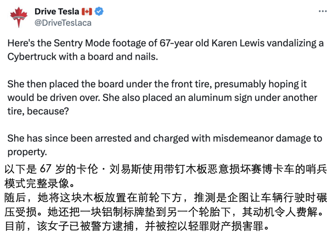 划车秒被抓!特斯拉哨兵模式全程记录,助警方24小时破案