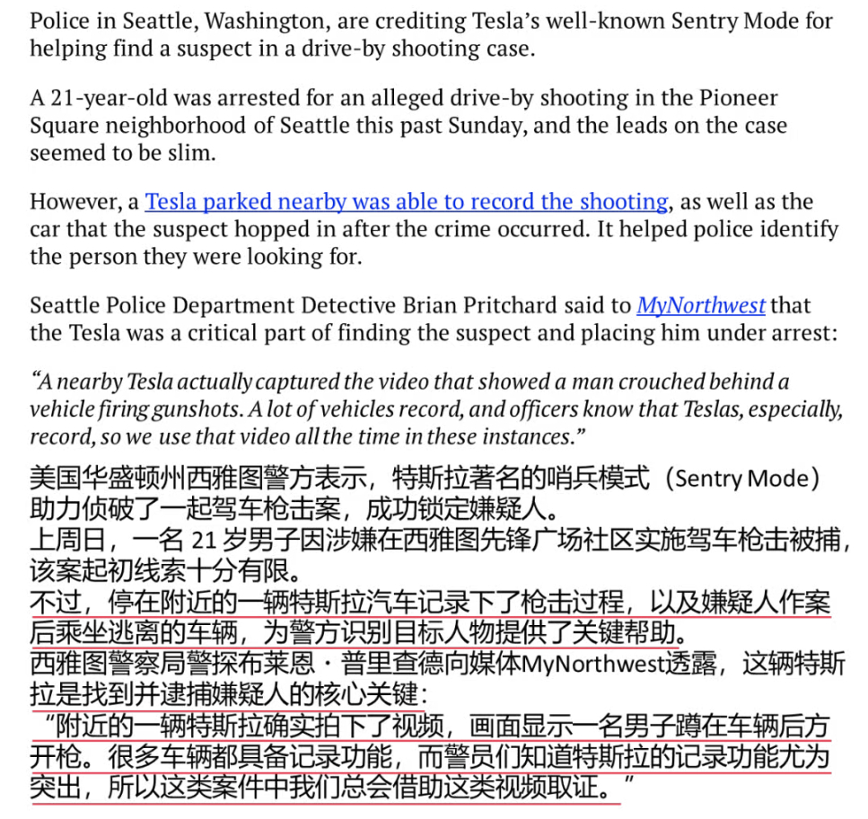 此前在华盛顿,一起驾车枪击案起初线索极少、侦破陷入僵局,最终是现场附近一辆特斯拉的哨兵模式记录下的画面,为锁定嫌疑人提供了决定性线索。