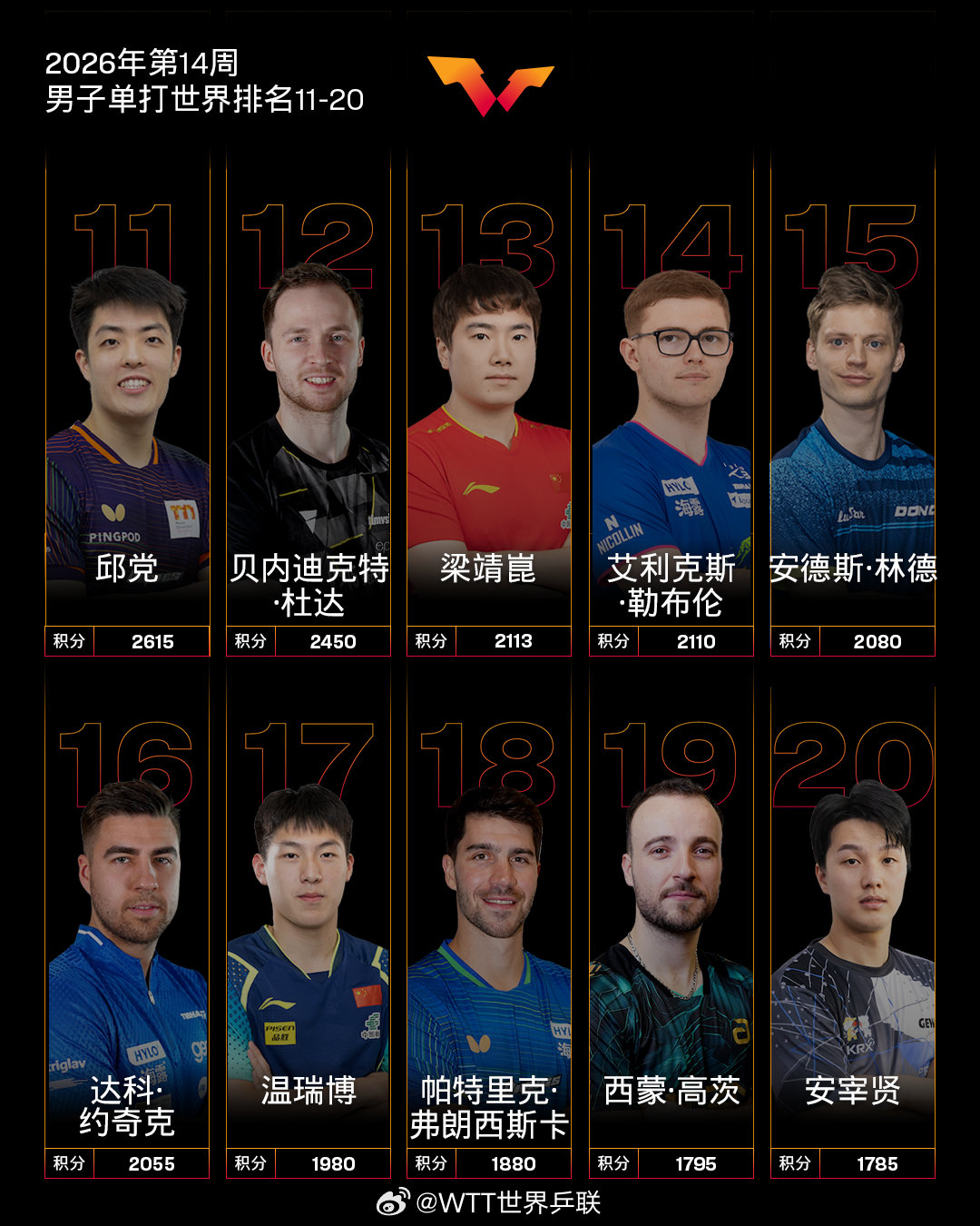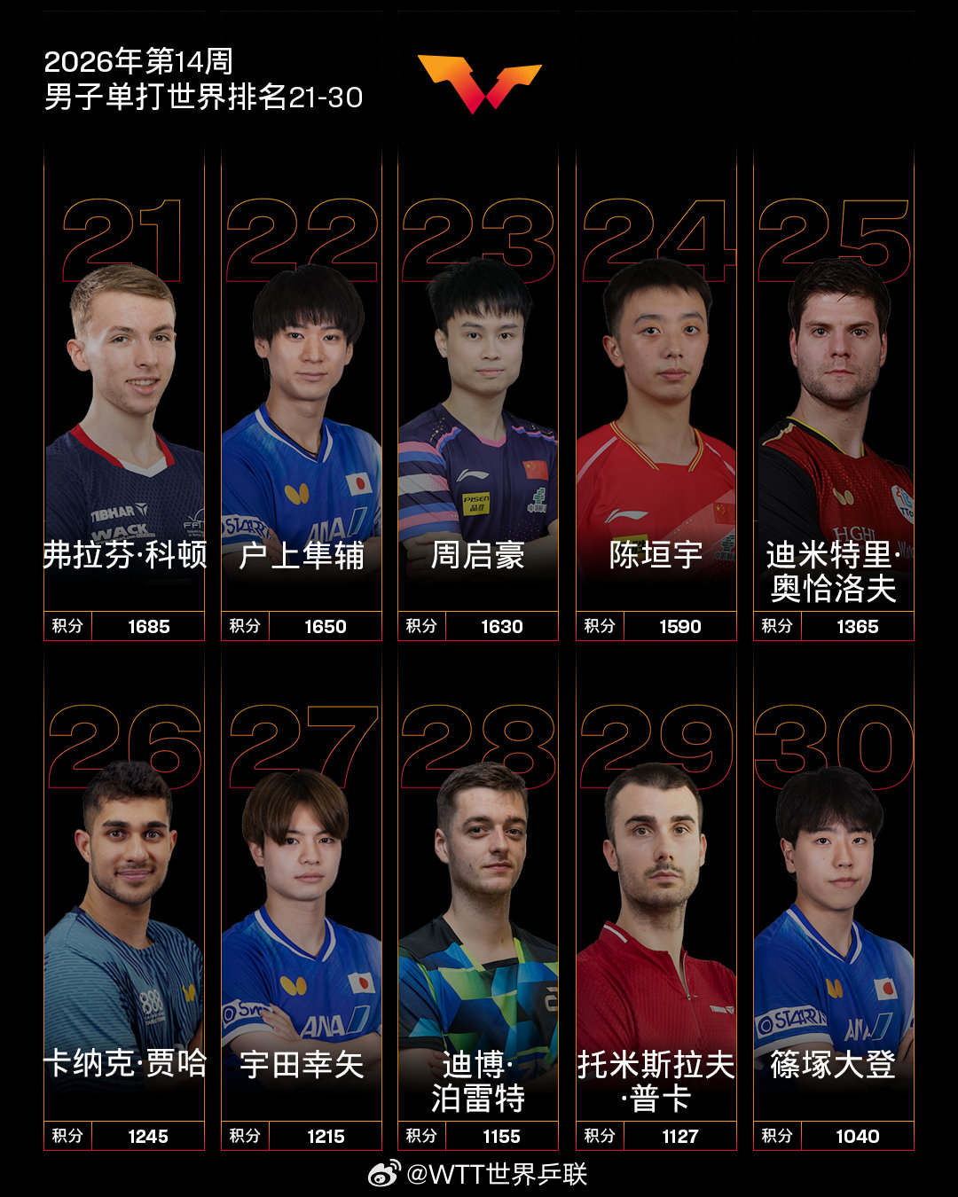 男子单打,中国队球员王楚钦位列第一,林诗栋位列第五,向鹏位列第九,梁靖崑排名第13,温瑞博排名第17,周启豪排名第23,陈垣宇排名第24,陈俊菘排名第37。