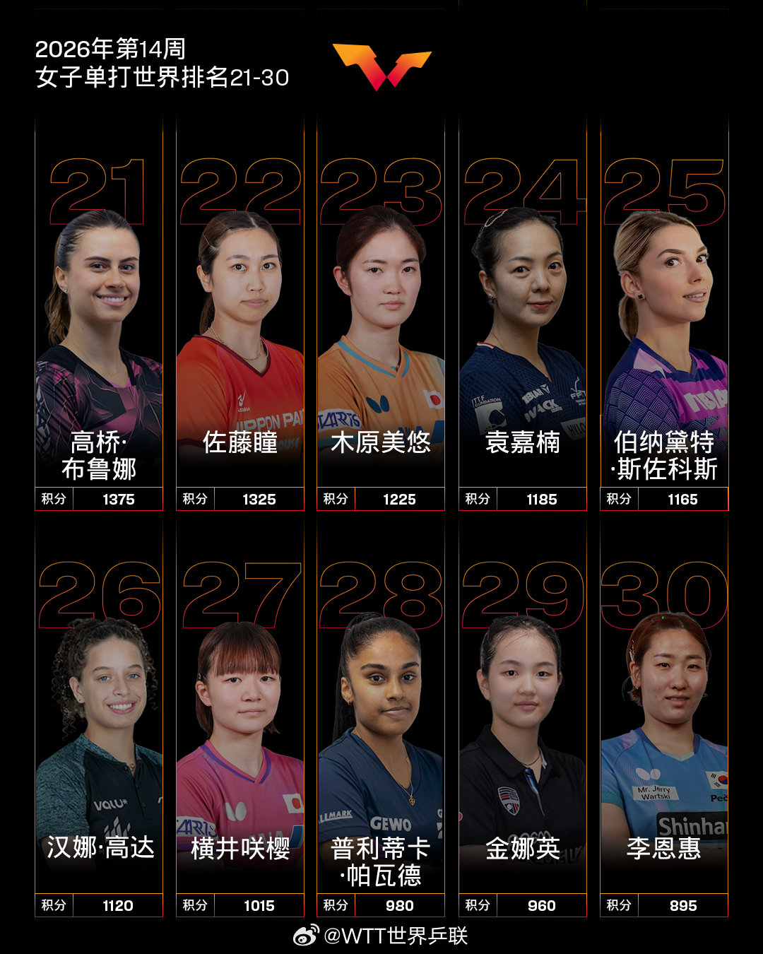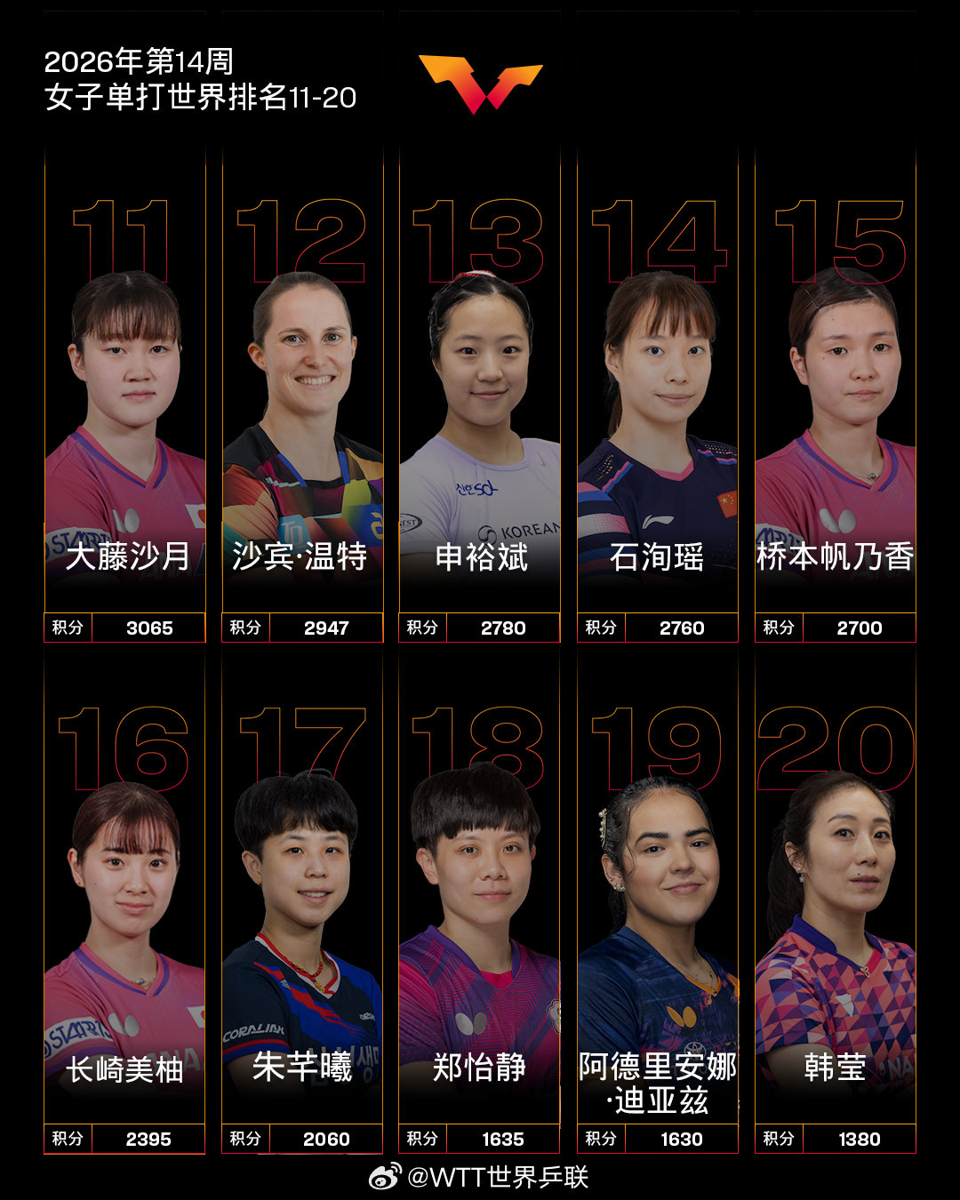 女子单打,女子单打,中国队球员孙颖莎、王曼昱、陈幸同位列前三,蒯曼位列第五,陈熠位列第七,王艺迪位列第八,石洵瑶排名第14,何卓佳排名第37,覃予萱排名第38。