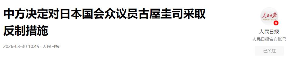 中方直接对日本政客古屋圭司出手了!这可不是普通的抗议,这是指名道姓的反制。中方由此也划出了自己的底线! 古屋圭司是谁?日本国会众议员,更是“日华议员恳谈会”的头目。从2026年3月30日起,他在中方境内的动产、不动产统统被冻结。这招够狠,直接切断了他的经济后路。 为什么单挑他下手?这家伙是个不折不扣的“反华急先锋”。从2018年开始,他就把窜访"台湾"当成家常便饭,跟岛内“台独”势力勾肩搭背,疯狂试探中方的底线。 他不仅去,还大放厥词。公开叫嚣“用武力保护台湾”,狂妄宣称“不允许大陆改变现状”。最近更是跳出来,力挺右翼政客高市早苗“台海有事”的荒谬言论。 这次制裁绝不是心血来潮。仔细看中方的反制脉络,其实早有预兆。之前无锡拆除日本风情街,樱花植树活动拒邀日方。这都是民间和地方在释放强烈的情绪信号。 既然软性警告听不进去,那就直接官方亮剑。这次对古屋圭司个人的财产冻结,就是从“民间表达”直接升级到了“精准打击”。 以前处理类似事件,我们多用宏观经济杠杆。现在变了,中方反制工具箱越来越丰富,直接落实到个人追责。想在中方赚钱,转头又去砸中方的锅?门儿都没有。 这也是对高市早苗政府的一次战略回应。日本右翼在“台湾”问题上屡屡挑衅,中方看得很清楚。这不是个别议员的个人作秀,而是政府层面的系统性试探。 中方这次出手,划下了两道极其清晰的红线。第一道就是领土主权。“台湾”问题绝对不可触碰。谁敢越雷池一步,谁就要付出惨痛的个人代价。 第二道红线是历史警示。日本右翼在台湾问题上蠢蠢欲动,背后是军国主义幽灵作祟。中方绝不允许日本在历史伤痕上再造危机。这笔账算得很清楚。 冻结财产这招杀伤力极大。它展示了中方跨域执法和追责的硬实力。打蛇打七寸,直接捏住政客钱袋子,这就是要在日本政界制造震慑效应。 那些还想在“台湾”问题上投机的日本政客,现在得好好掂量了。操弄涉台议题捞取政治资本,代价就是你在华商业利益瞬间归零。这买卖还划算吗? 面对涉台挑衅,中方不再仅停留在外交抗议。动用法律工具实施精准制裁,说明我们的应对手段正走向制度化、法律化。这种反制正在常态化。 选在3月30日这个节点,直指反华大本营,中方实质上是在逼迫日本政界进行“风险切割”。高成本惩罚机制已启动,非此即彼的单选题摆在面前。 这不是简单的双边外交摩擦,而是标志性的战略博弈升级。中方在维护核心利益上,防御姿态更主动、精准。任何越线者,必将面临不可逆的系统性反制。