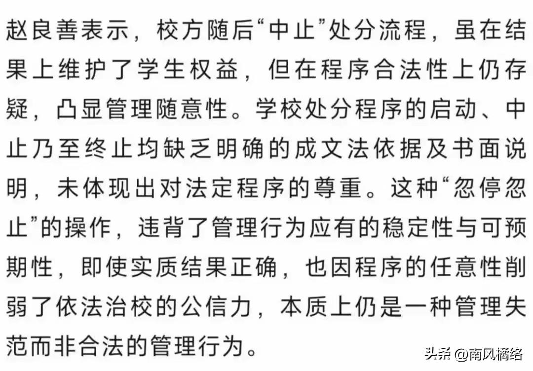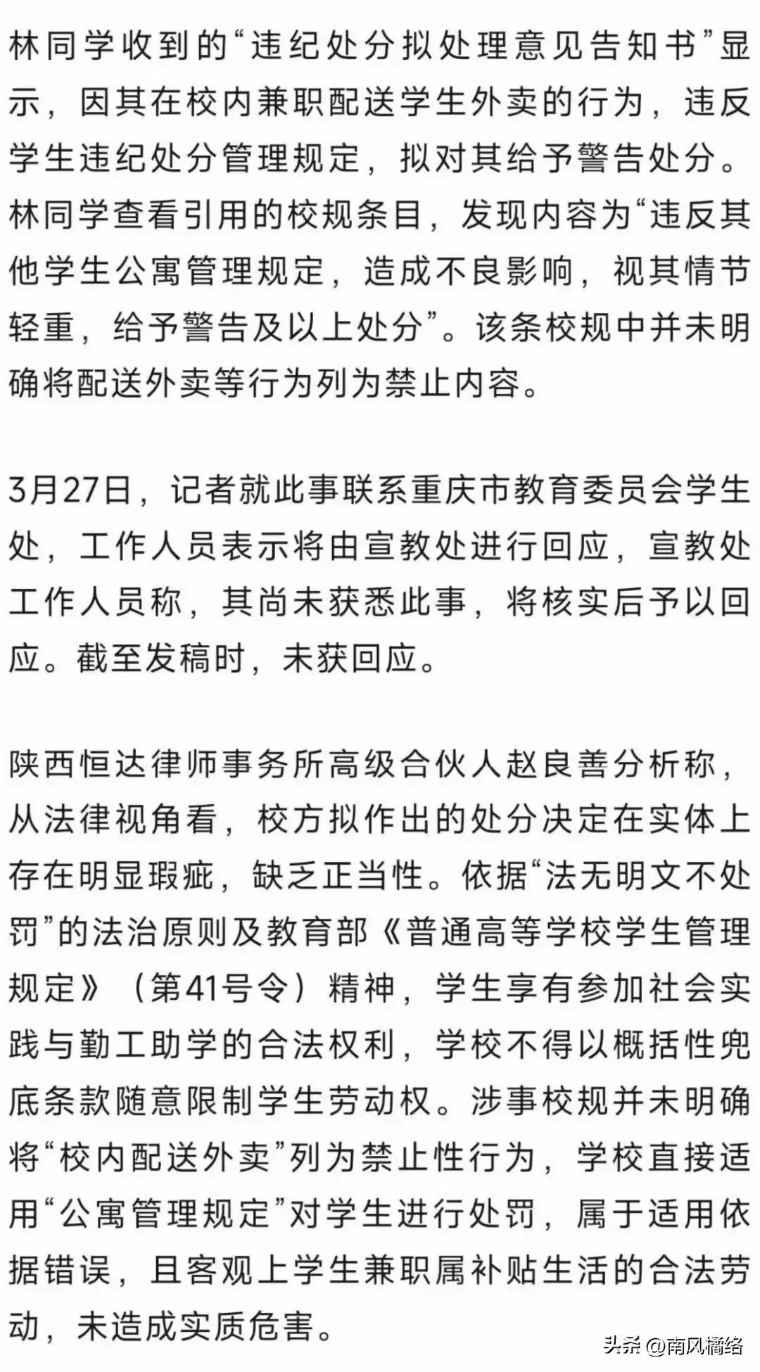 重庆高校多名贫困生兼职送外卖被处分,校方被舆论压力已中止处分 重庆一高校多名贫困生兼职送外卖被处分,最新进展,校方已中止处分流程,重庆工信职业学院的林同学说,因兼职配送校内学生的外卖,自己收到了来自学校的违纪处分通知书。 但是,万万没想到,事情马上就有了反转,校方又中止了处分的流程,让这起风波变得扑朔迷离。 林同学是大一的新生,今年一月份就开始在学校里面送外卖来补贴自己的生活,第一次被发现后,她还被要求写了保证书,结果再一次被抓了,就收到了正式的处分告知,跟她情况一样的,还有十多位同学,不少人因为家庭条件并不好。 而学校给出的处分理由是“违反学生公寓管理规定,造成不良影响”,事情被曝出来后,校方很快的出来回应说,已经和学生们沟通过了,处分程序已经暂停了,没有给学生造成实质性的处罚,事情也算是得到了妥善的处理。 学校为什么要禁止,表面看起来是为了校园里面的秩序和安全,甚至可能与学校里面的商业利益有关,但深层的原因,是管理上的“图省事”,用一个模糊的“违反公寓管理规定”来处罚,这种“一刀切”的做法,已经暴露了管理能力上的不足。 实际上,学生参加勤工助学是法律赋予的权利,律师也指出,学校不能用笼统的规定来随意的限制,也有研究表明,大学生兼职的法律身份很复杂,有的时候权益得不到保障,维权的意识也比较薄弱,这就需要学校的引导和支持。 更何况,很多学生送外卖是为了赚生活费,是刚需,林同学她们中里面不乏有很多家庭困难的,一个简单的禁止,已经无异于堵住了她们自食其力的路,更合理的做法是去疏导,比如规范配送的流程,或者设立一个配送岗,提供更多的安全勤工助学的机会。 现在很多随着校园经济的兴起,学生的需求也越来越多样化,传统的管理模式怎么样去适应新的情况,然后在维护秩序和保障学生权益之间找到一个平衡点,是很多学校都会面临的一个挑战。 有网友说:“校内外卖兼职别太严了,好多困难生就是靠这吃饭都,” 这一句话道出了很多贫困学生的心里话。 这件事情从一个学生的兼职风波,演变成了现在对高校管理模式的讨论,学校先是强硬的处分,然后被关注了之后又反手中止,看起来已经解决了问题,实际上是暴露了规则的模糊和管理的被动,面对学生们实实在在的生存需求,学校真的只能靠“堵”和“罚”吗? 其实学校可能也是怕出事情,想管好校园,这初衷不坏,但学生不是冰冷的管理对象,他们也有自己的难处,特别是那些想靠自己的双手挣钱的学生,更不应该被一纸模糊的规定来为难他们,多一点点人情,多想一点办法,比冷冰冰地发处分通知强多了。