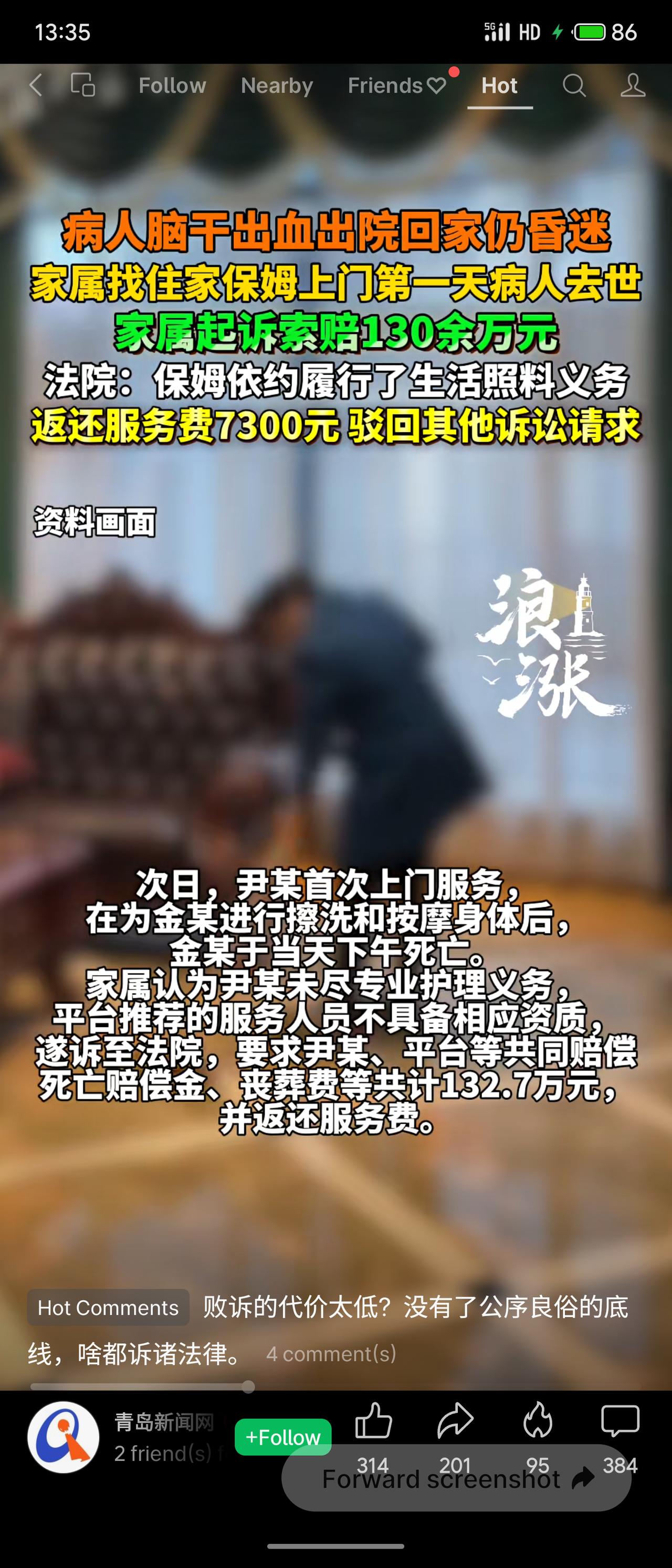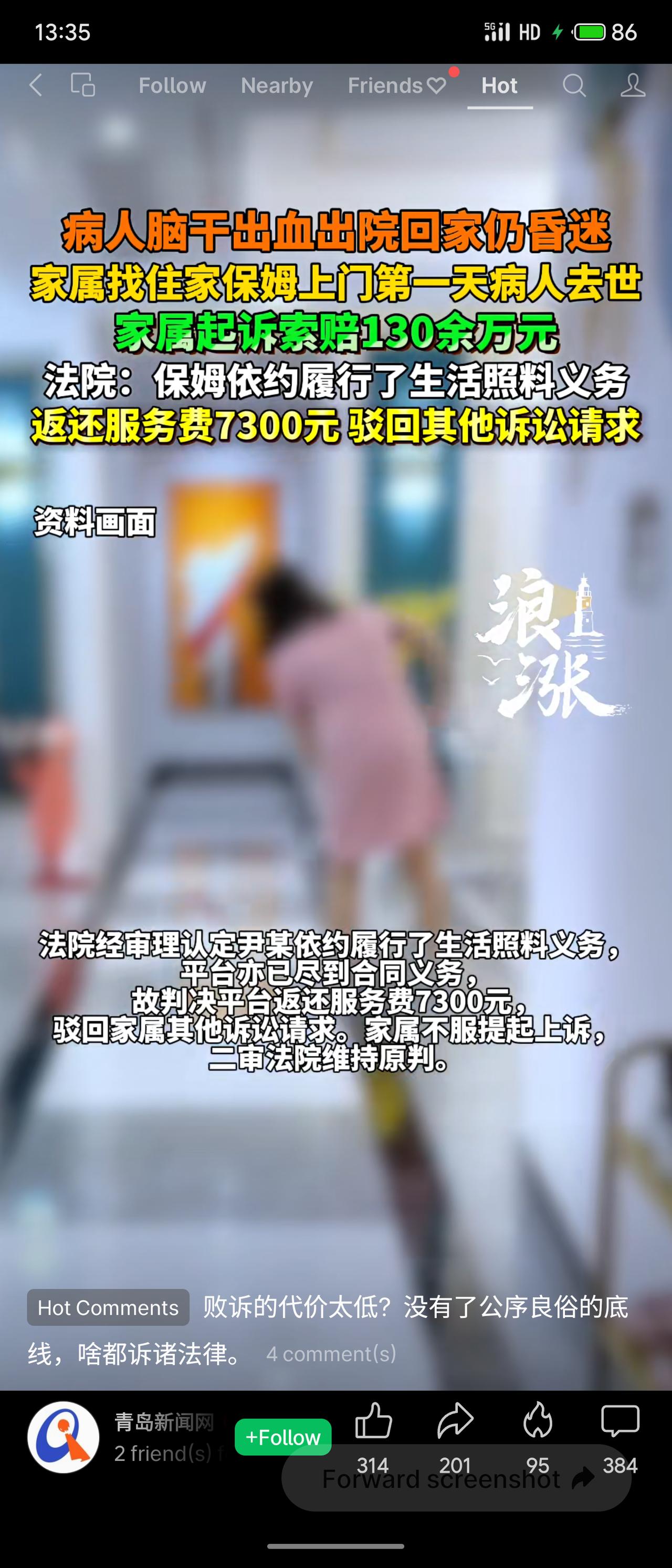 一起涉及家政服务与患者照护责任的侵权纠纷。金某因脑干出血出院时仍处于昏迷状态,家属通过平台聘请住家保姆尹某,约定服务内容为生活照料。尹某上门当日为金某擦洗、按摩后,金某去世。家属以未尽专业护理义务、平台推荐无资质人员为由索赔132万余元。 法院审理认为,尹某依约履行了生活照料义务,平台亦尽到合同义务,无证据表明其行为与死亡存在因果关系,故仅判决返还服务费7300元,驳回其他诉求,二审维持原判。 简评:本案厘清了生活照料与专业医疗护理的法律边界,强调家政服务人员在约定范围内履职不当然承担医疗救治责任,对规范家政服务业、明确各方权责具有典型意义。