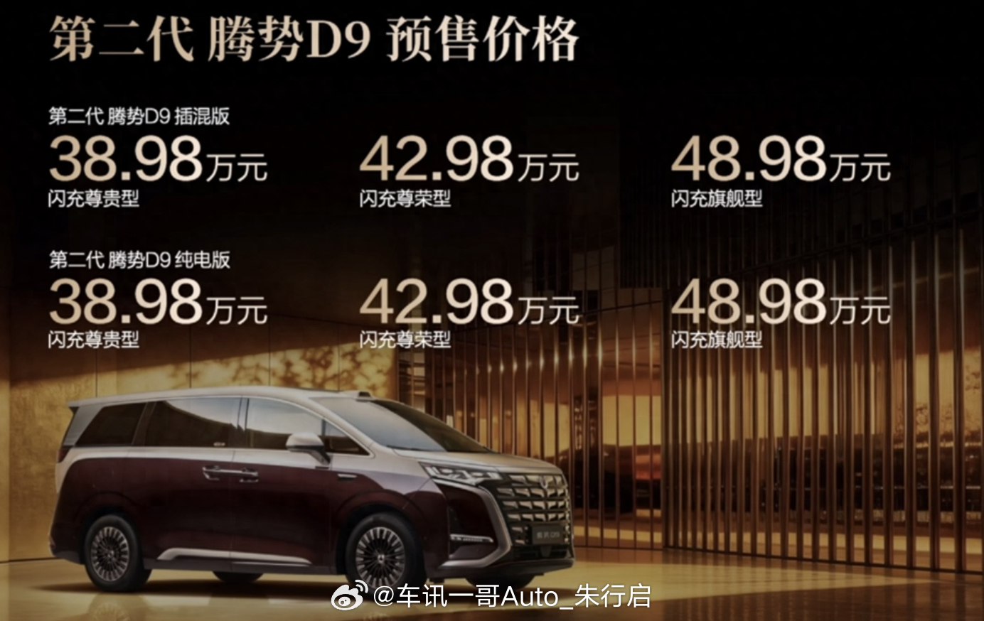 新款腾势D9正式开启预售,推出纯电版和插混版共6款闪充车型,38.98万起,新车搭载第二代刀片电池及闪充技术,全系标配激光雷达和和天神之眼5.0。