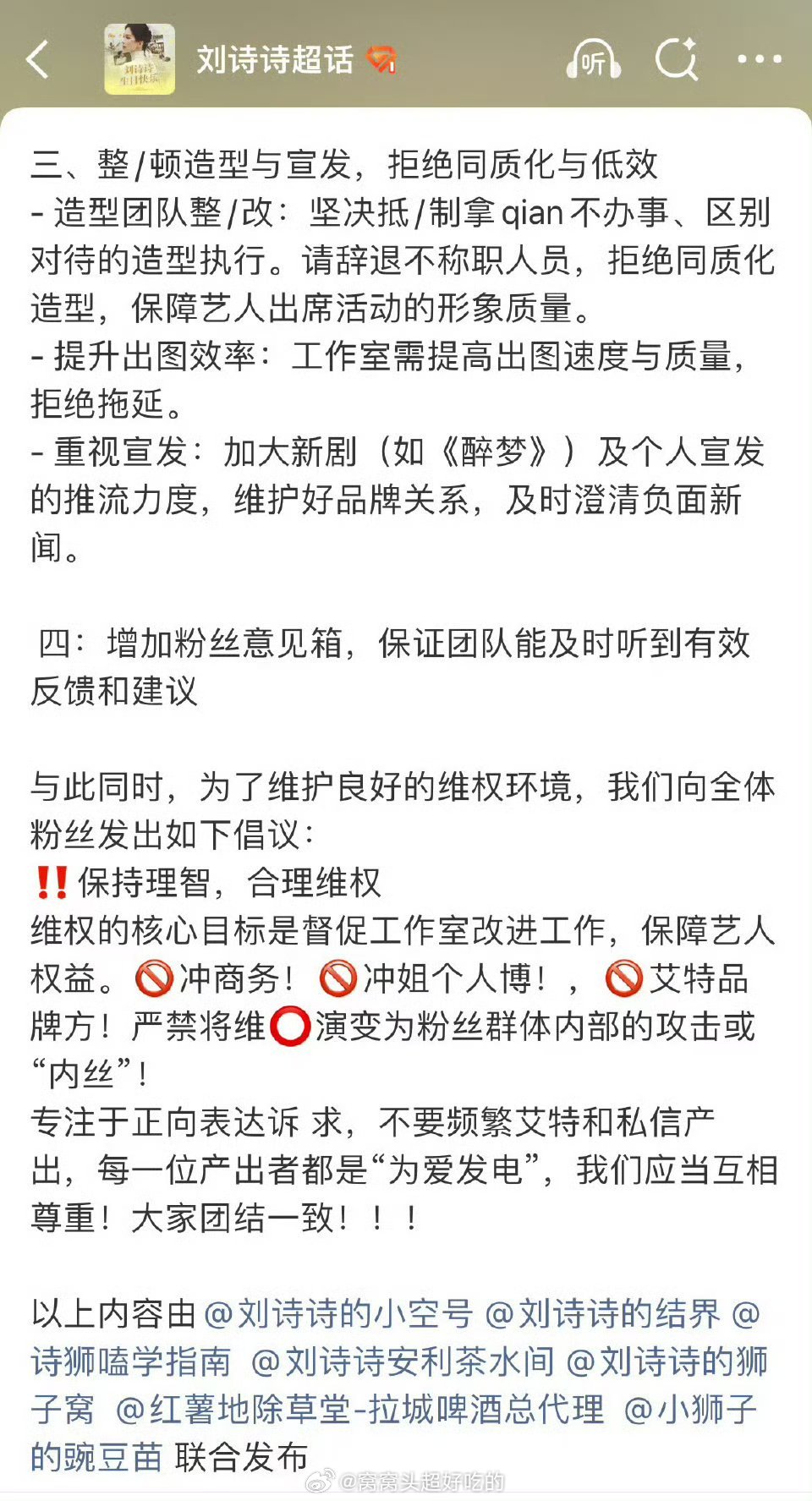 刘诗诗站姐联合发文,提出要求希望整改