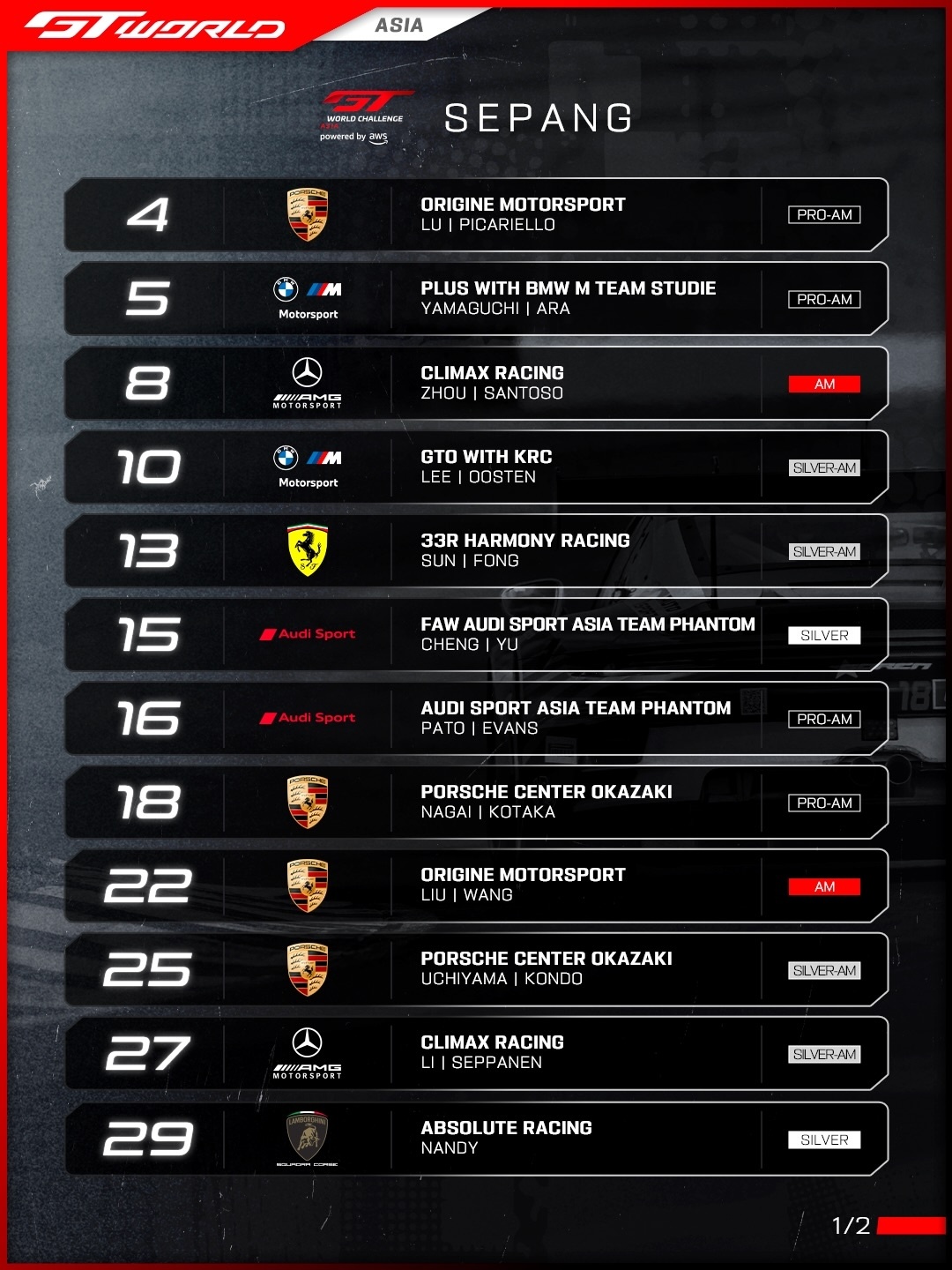 🇨🇳/🇨🇳🇭🇰车队方面👀:🏎Origine Motorsport(原力赛车),本赛季带来两台保时捷911 GT3 R Evo赛车(4号车组:车手吕威➕保时捷官方车手Alessio Picariello和Laurin Heinrich,22号车组:车手王仲玮➕车手刘航成)