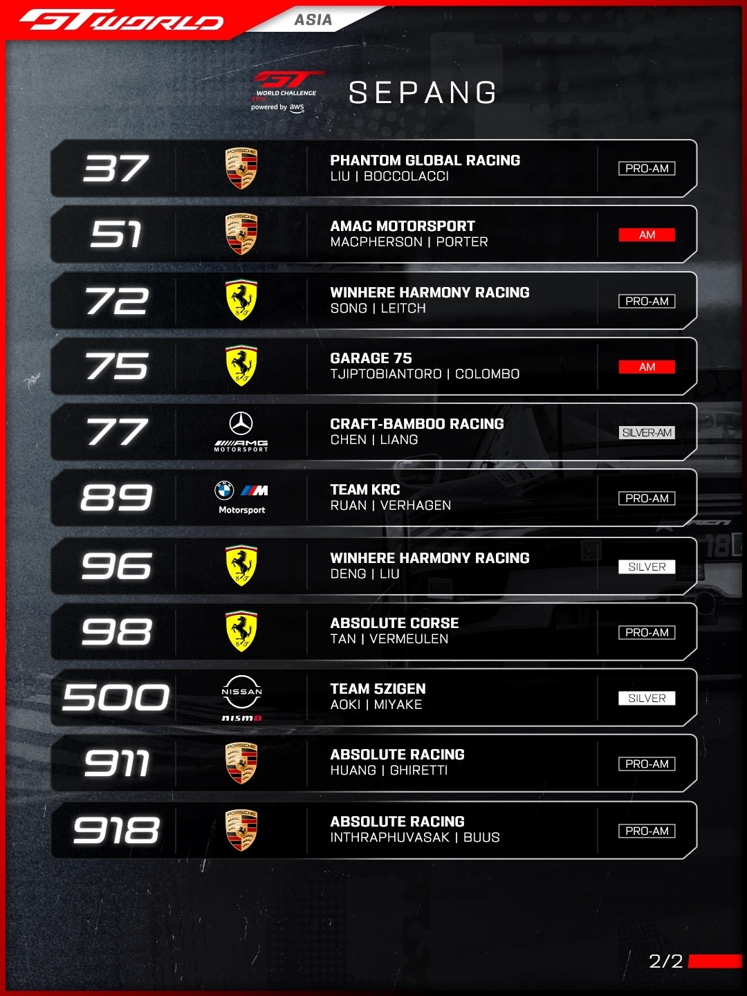77号车组参与到Silver-Am组别—————————————————————— 🏎Phantom Global Racing带来两台奥迪R8 LMS GT3 Evo2赛车和一台保时捷911 GT3 R Evo赛车(15号车组:车手程丛夫➕车手余快,16号车组:车手Andres Pato➕车手Jaxon Evans,37号车组:车手刘旭➕保时捷亚太车手Dorian Boccolacci)
