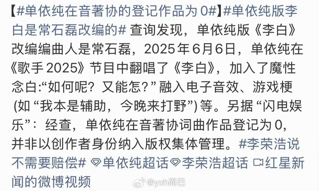 单依纯在音著协的登记作品为0音著协登记的词曲,但也不是所有歌的词曲都在吧。这也值得讨论吗?以唱功出圈的歌手音著协没登记作品也很正常,大家散了吧。用数字来单一维度去定义一个人,未免太苛刻了。