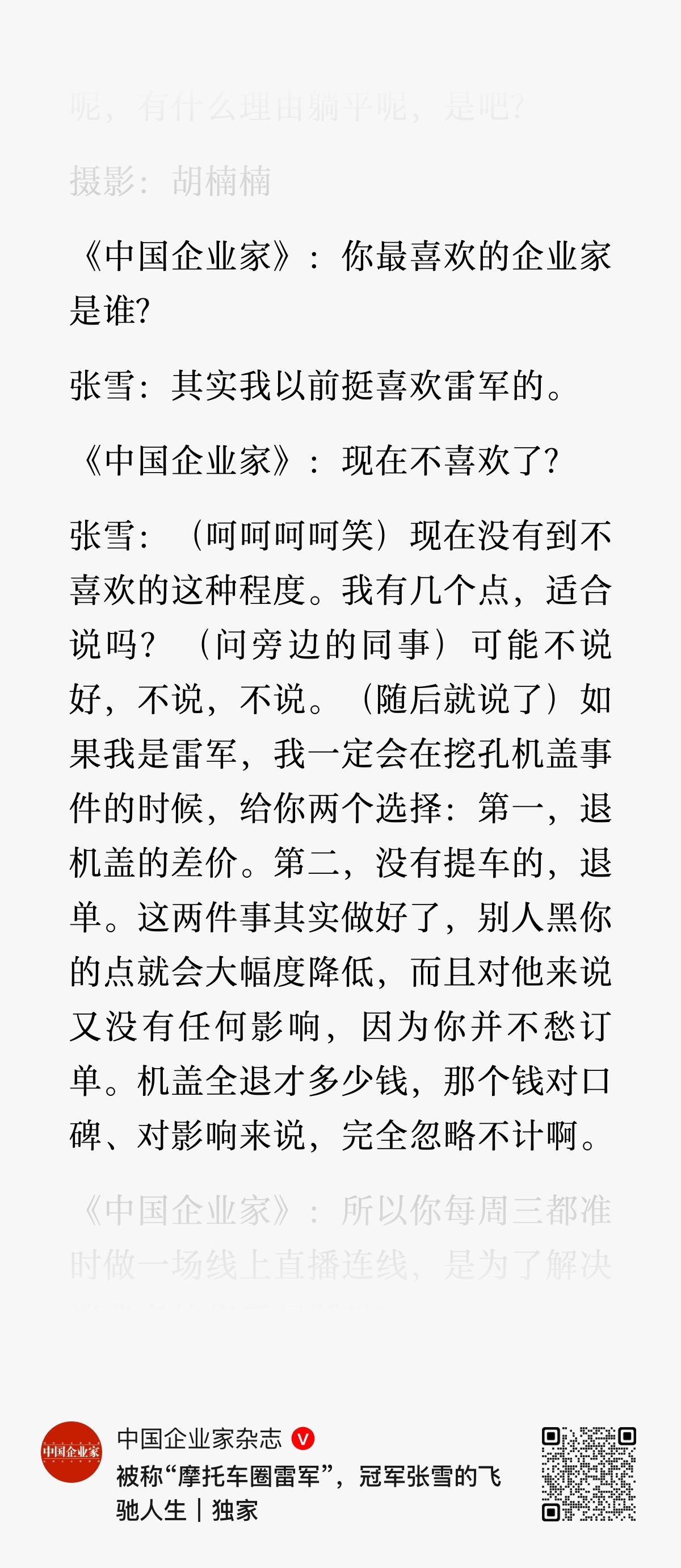 问张雪最喜欢的企业家,他说以前挺喜欢雷军的 不过后面这段话很危险,估计接下来张雪