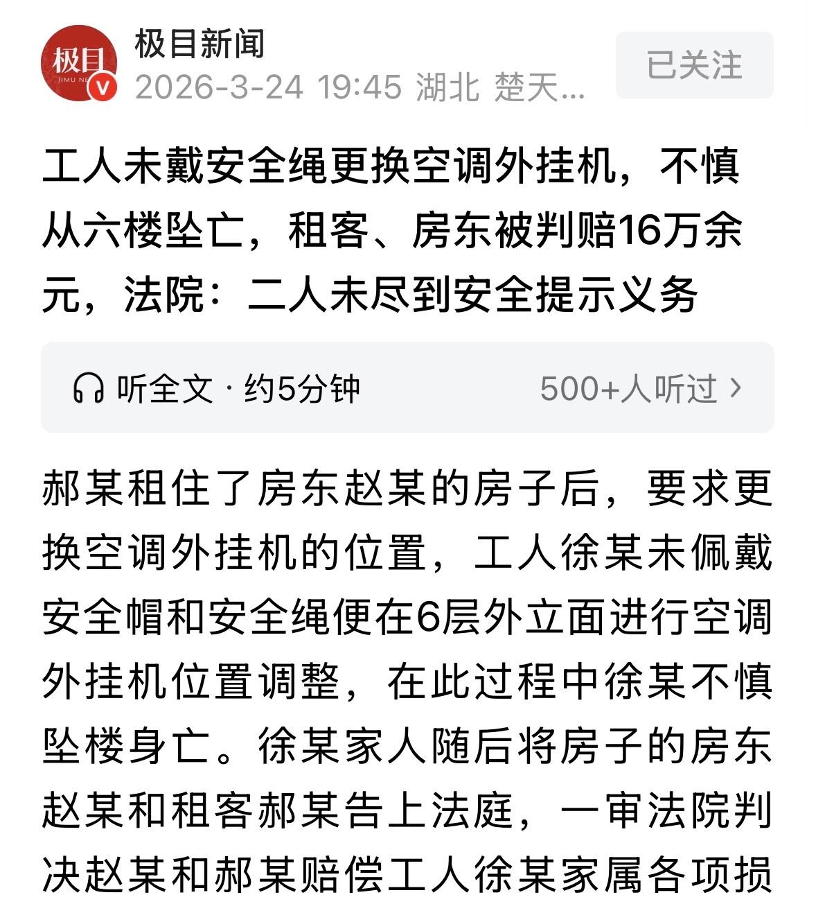内蒙古巴彦淖尔,男子不满意出租屋空调外挂机的位置,房东就请工人调整,谁料,工人操作时没系安全绳,也没戴安全帽,最终从6楼坠亡。工人的家属事后将房东和租客全部告上法院索赔,法院判决出乎意料! 房东赵某把房子租给了郝某,这本是一桩普通的租赁买卖,谁料,几台空调的挪位竟然闹出了人命。 2023年国庆节那天,郝某正式签了租房合同。 住进去之前,郝某觉得屋子里的隔断碍事,空调挂机的位置也不顺眼,就要求赵某给整改一下。 房东赵某倒也爽快,既然租客开了口,那就修。 10月4日这天,赵某给工人徐某打了电话,让他带着媳妇一块儿过来干活。 徐某是个干私活的师傅,干活倒也利索。他到了地方,先按照赵某的要求安好了第一台内机,赵某当时就通过微信把260块钱的工费转了过去。 活干到一半,原本没在现场盯着的赵某先忙别的去了,留下租客郝某在屋里。 这时候,郝某看着外面那台空调挂机,觉得位置还是不太理想,就指使徐某去六楼外墙立面上给挪挪地方。 意外就在这几分钟里发生了。 徐某虽然带着工具,可那天他既没戴安全帽,也没系安全绳。就在他翻出六楼窗户,在狭窄的外立面上调整空调挂机时,脚下突然踩空,整个人瞬间从六楼栽了下去。 虽然家里人赶紧把他送去医院抢救,但由于伤得太重,最后还是没救回来。 人没了,家属自然要讨说法。徐某的家里人把房东赵某和租客郝某全告了,索赔金额不小。一审法院审理后,判了赵某和郝某共同赔偿16.5万多元。 这下赵某和郝某都觉得冤枉。赵某觉得第一台安完他就给钱清账了,后面挪外机是租客私自找工人干的,跟自己没关系。 郝某则觉得,是工人自己不系安全绳,绳子就在现场放着他不用,怎么能怪到租客头上? 案子闹到了中院。 二审法官认为,这在法律上叫“承揽关系”。简单说,你花钱雇人干个活,只要这活儿是有危险的,你就有“选人”和“盯着点”的义务。 法院认为,虽然赵某不在现场,但活儿是他找人来干的,郝某接手继续指使,这两个动作在时间和空间上是连着的,得算成一个整体活儿。 所以,赵某和郝某就是共同的“定作人”。 最大的问题在于,他们找徐某干活的时候,根本没查人家有没有高空作业证,也没在徐某翻窗户时提醒他把绳子系好。这就是法律上的“选任和指示过失”。 当然,徐某作为成年人,明知六楼高空作业危险,自己有证没证心里清楚,还不戴护具,这是拿命开玩笑,所以他自己要承担85%的大头责任。 剩下的15%,就由房东和租客这俩“雇主”共同承担。 二审法院最后维持了原判,驳回了上诉。 所以说找人上门干活,尤其是爬高下低这种危险活,千万别随便路边拉个人就干,更不能看人家不系安全绳还不管。 生活中这种“差不多就行”的心态最要命。看似省了事,实则埋下了大雷。 对比,你怎么看? 关注@运良说法 学法律知识不迷路