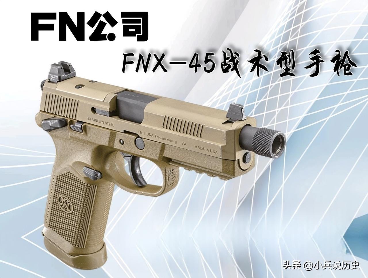 FN FNX-45战术型手枪 FNX-45手枪是FN公司推出的战术手枪,在FNX-9和FNX-40之后推出,使用0.45英寸ACP弹,弹匣能装10发或15发。 枪管是冷锻不锈钢做的,长度135毫米,枪口有标准螺纹,配的保护帽带滚花防滑纹,抓着不滑。 要装消音器的话,拧下保护帽就能换,很简单。 套筒是不锈钢的,抽壳钩能提示有没有子弹,枪里有弹时它会凸出来,看得见摸得到。 准星和照门后面有氚光管,天黑看不清的时候也能瞄准。 枪有击针自动保险,手动保险、空仓挂机解脱杆、弹匣卡笋左右都有,左撇子也能用。 手动保险有三个状态:保险、待击,还有击锤解脱待击。 拨到击锤解脱待击位置,待击的击锤会自动回位,这种设计不多见。握把后护板有四种尺寸,适合不同手型的人。扳机是单/双动,扳机护圈前有皮卡汀尼导轨,能装战术附件。