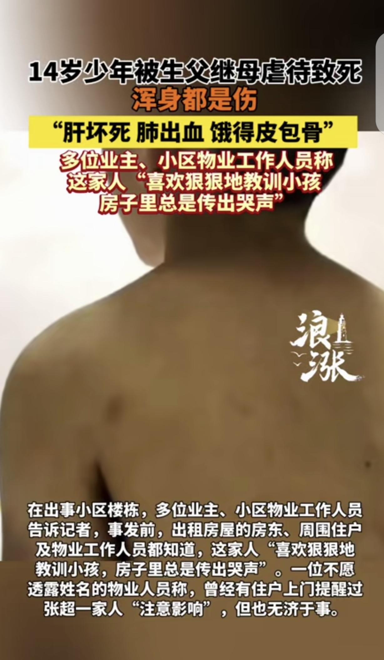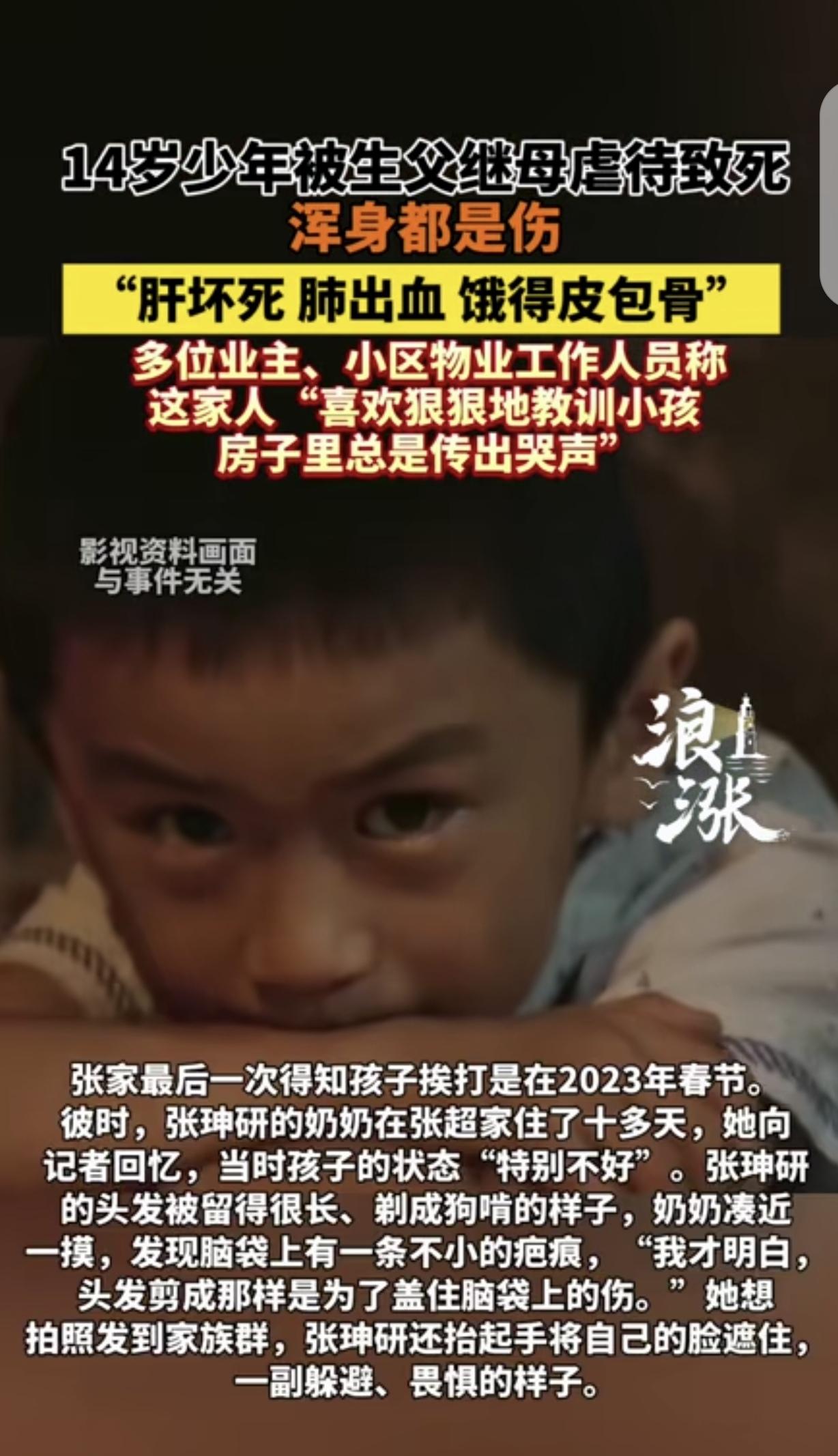 [中国赞]一奶奶去看12岁孙子,看见孙子头发长的跟狗啃的似的,她一摸,发现孙子脑袋上好多触目惊心的伤口,头发长了不剪是为了掩盖伤疤,这肯定是孙子的继母打的,奶奶愤怒的跟儿子儿媳吵了一架决裂。万万没想到,2年后,14岁的孙子竟被生父继母虐待致死。业主反映:这家人喜欢狠狠地教训小孩,房子里总是传出哭声。 (信源:浪涨新闻) 当14岁男孩的遗体被发现时,在场所有人都被刺痛到失语:瘦骨嶙峋的身躯轻如枯叶,身上布满新旧交错的伤痕,陈旧骨折清晰可见,尸检报告字字泣血——肝坏死、肺出血、多器官衰竭,每一项都在诉说着他生前遭受的无尽折磨。 这个本该在阳光下奔跑的少年,竟在生父与继母的长期虐待中,熬过了两年暗无天日的时光,而悲剧的伏笔,早在两年前就已埋下。 男孩12岁那年,奶奶从老家赶来探望,当她轻轻拨开孙子遮到眼睛的长发时,瞬间浑身冰凉:孩子的头皮上,密密麻麻布满了新旧伤口,有的结痂发黑,有的隐隐渗血,狰狞的伤痕顺着头皮蔓延。 奶奶瞬间明白,孙子留着不合年龄的长发,从不是爱美,而是为了掩盖继母施暴的痕迹,躲避刺骨的疼痛与屈辱。 愤怒的奶奶当即找到儿子和儿媳,激烈斥责他们的残忍,坚决要求带走孙子,却遭到强硬阻拦。他们否认虐待,指责奶奶多管闲事,甚至出言辱骂,最终将奶奶硬生生赶出家门,两人彻底决裂。这一决裂,成了男孩坠入深渊的开始。 此后两年,奶奶从未放弃寻找孙子,一次次上门被拒,一次次打电话被敷衍,要么说孩子在上学,要么说身体不舒服,始终不让她见一面。 偶尔在小区远远瞥见,那个曾经活泼开朗的小男孩,已成了身形单薄、眼神麻木的少年,穿着不合身的旧衣服,走路小心翼翼,满眼恐惧怯懦,连抬头看奶奶一眼的勇气都没有。 奶奶看在眼里、疼在心里,却无能为力。她不知男孩在她看不到的地方正遭受地狱般折磨。生父与继母将戾气发泄在他身上,动辄打骂,还长期不让他吃饱饭。他们把虐待伪装成“管教”,以“家务事”为借口,对外扮合格父母,蒙蔽了多数人。 这场持续两年的虐待,并非毫无痕迹。小区邻居时常听到男孩家中传来凄厉的哭声,那绝望与恐惧,隔着房门都能清晰感受到。 还有邻居偶尔看到孩子身上的伤痕,察觉到异常,却都抱着“多一事不如少一事”的心态选择沉默,没有人主动询问,没有人及时报警,任由悲剧一步步发酵。旁观者的沉默,成了施暴者的“帮凶”,也错过了拯救少年的最佳时机。 终于,在男孩14岁那年,长期虐待彻底压垮了他瘦弱的身躯。当生父继母发现孩子失去意识时,才慌乱拨打急救电话,可一切都太晚了。 医生赶到时,男孩已无生命体征,他身上的每一处伤痕,都是两年间日复一日的虐待留下的印记,尸检报告彻底揭开了这场隐蔽的暴行——长期暴力殴打、饥饿折磨,最终导致他多器官衰竭身亡。 案件曝光后,生父与继母依法被捕,将受法律严惩。但那个14岁少年再也回不来了,他本该有的青春与未来永远定格在黑暗中。 这场悲剧是多重因素叠加的结果:生父懦弱失职,转嫁不幸;继母残忍冷漠,将孩子当发泄工具;“棍棒底下出孝子”观念扭曲其认知;社会保护防线缺失、旁观者沉默,致虐待持续两年。 这场悲剧给全社会敲响了警钟:对虐童行为,必须零容忍!家长要坚守监护责任,摒弃老旧教育观念,用爱守护孩子。 邻居、路人要摒弃“事不关己”的心态,发现疑似线索及时报警,一次询问、一次举报,都可能拯救一个孩子;相关部门要完善保护机制,强化联动,落实强制报告制度,补齐短板,让施暴者无处遁形。 愿14岁少年在另一个世界再无痛苦、暴力,拥有快乐与自由;愿每个孩子被世界温柔以待,在爱与守护中健康成长;愿施暴者受严惩,旁观者不再沉默,全社会凝聚合力筑牢未成年人保护防线,让虐童悲剧不再上演。
