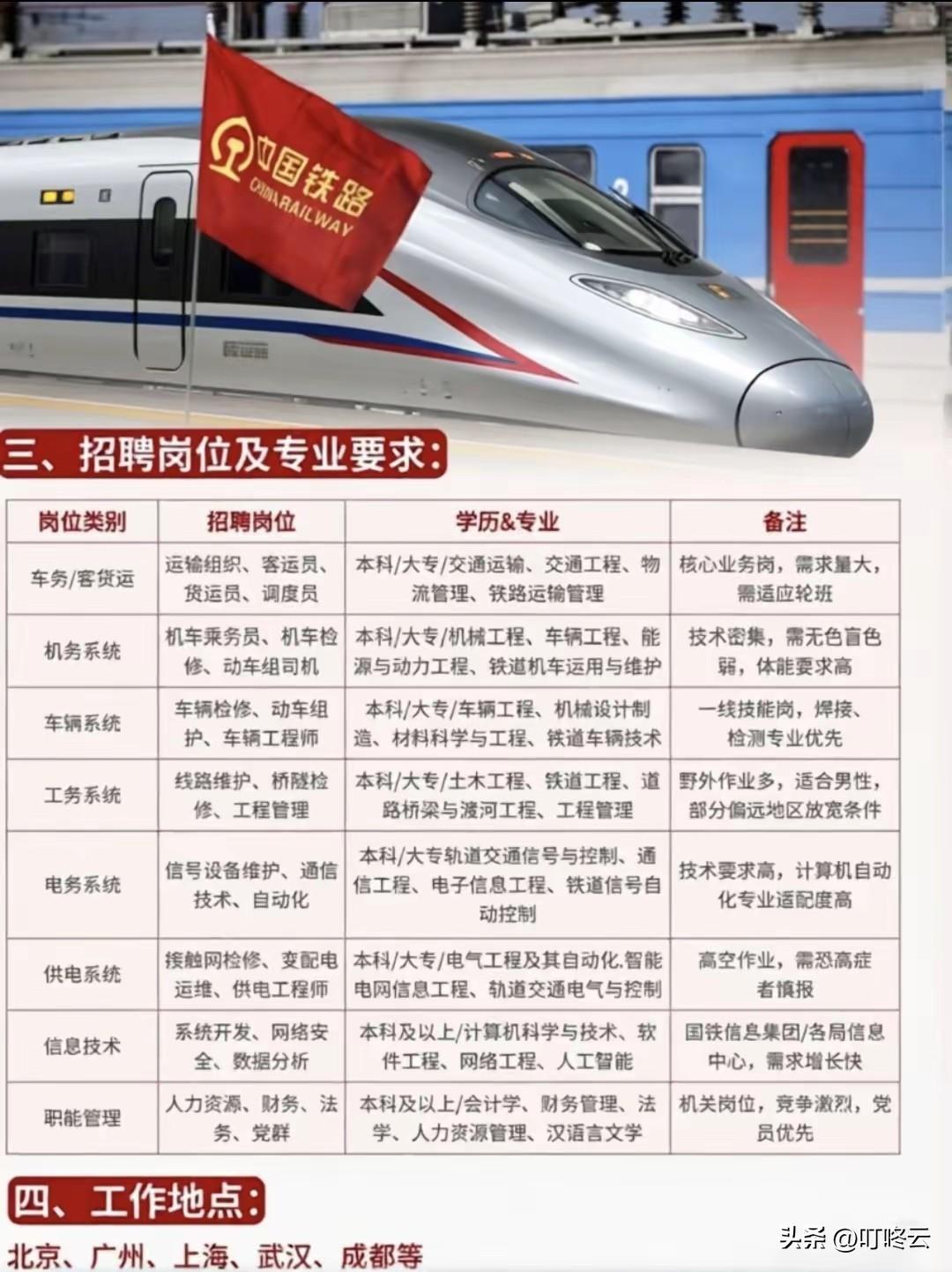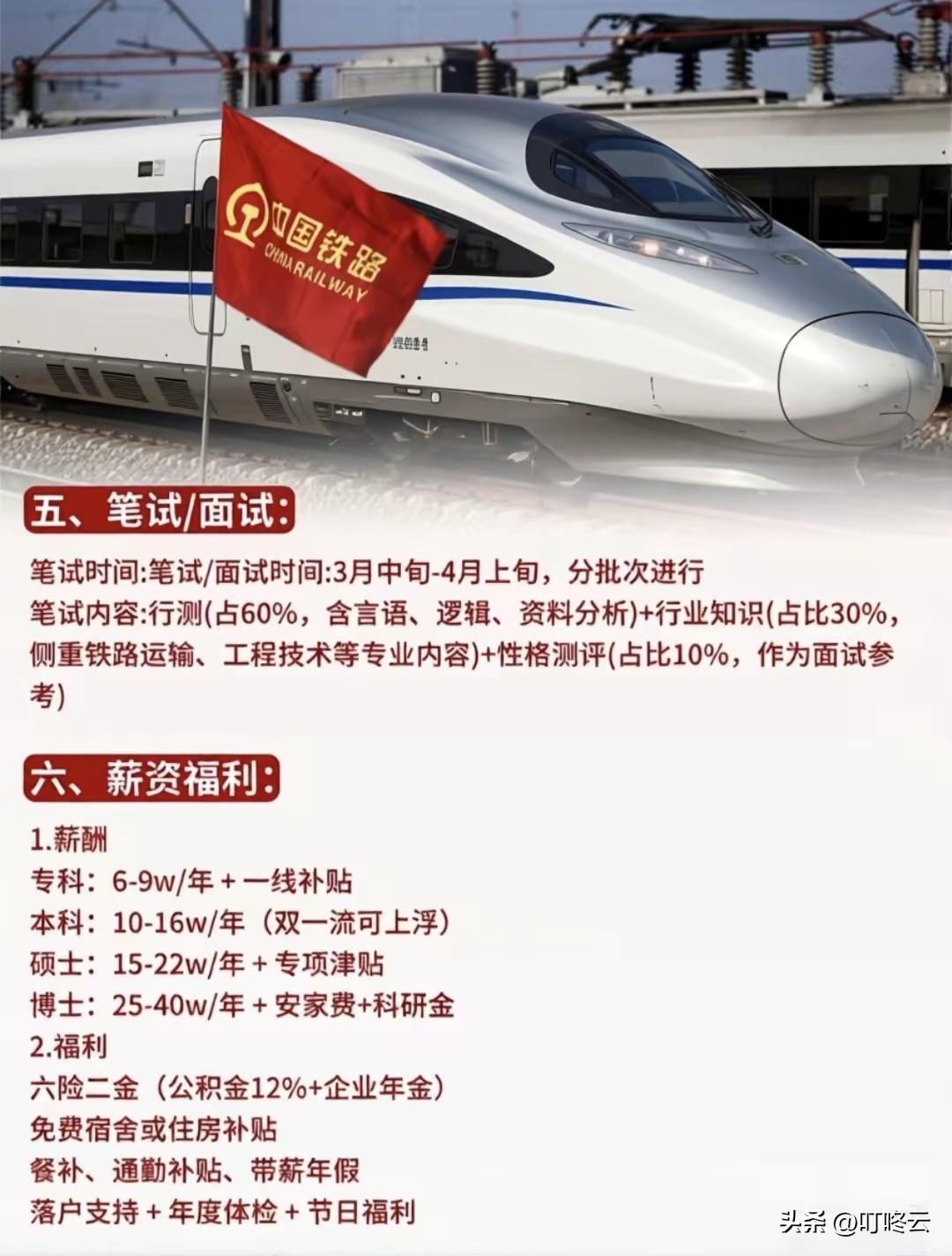大专进铁路好吗,都做什么工作?🚆 中国铁路2026春招|应届生上岸全攻略!速速围观揭秘详细内容!@叮咚云 帮你解读重点和职业规划指导![福][福][烟花][烟花] - ⏰ 报考窗口期明确:网申时间为2026年1月25日至4月15日,流程为公告报名→资格审查→综合测试→入职体检→正式录用。近三年数据显示,3月中旬为报名峰值,此时段投递岗位匹配度更高,资格审查通过率较首尾时段高出12%。 - 🎯 招聘对象友好:核心面向2026届应届生+2025届未就业毕业生,大专起报,部分岗位放宽至铁路相关专业往届生。本科及以上学历优先,硕士/博士岗位占比达18%,部分岗要求英语四级425分+,这类高学历岗平均上岸率为47%,高于专科岗的32%。 - 🧩 核心岗位&专业适配: - 车务/客货运:需求量最大,2025年招录占比28%,交通运输类专业适配,适合偏好管理岗的同学。 - 机务/车辆系统:技术壁垒高,2025年招录占比23%,机械类、铁道机车专业为主,司机岗持证上岗率仅35%,资深岗年薪可达20万+。 - 电务/供电:技术密集型,2025年招录占比17%,信号、电气类专业适配,晋升速度快于运营岗。 - 信息技术/职能岗:需求增长快,2025年招录占比12%,计算机、财会类专业竞争激烈,党员优先。 - 📍 工作地点覆盖广:北京、广州、上海等核心城市均有岗位,偏远地区岗位放宽条件,上岸率高出核心城市8%。 数据显示:专科生优先选车务、工务等一线岗,上岸率更高;本科生可冲刺机务、电务技术岗,薪资涨幅更优;硕士/博士可瞄准信息技术、职能管理岗,发展空间更大。[福][福][烟花][烟花] 欢迎关注@叮咚云 就业择业指导,帮你快速拿到央国企offer!将优先为粉丝职业规划指导,为你定制最适合的就业择业方案!欢迎留言交流讨论。[来看我][来看我] 免责声明:图片来自网络,仅供参考 央国企求职招聘 国企春招攻略 央国企求职就业铁路专业求职 铁路系统求职