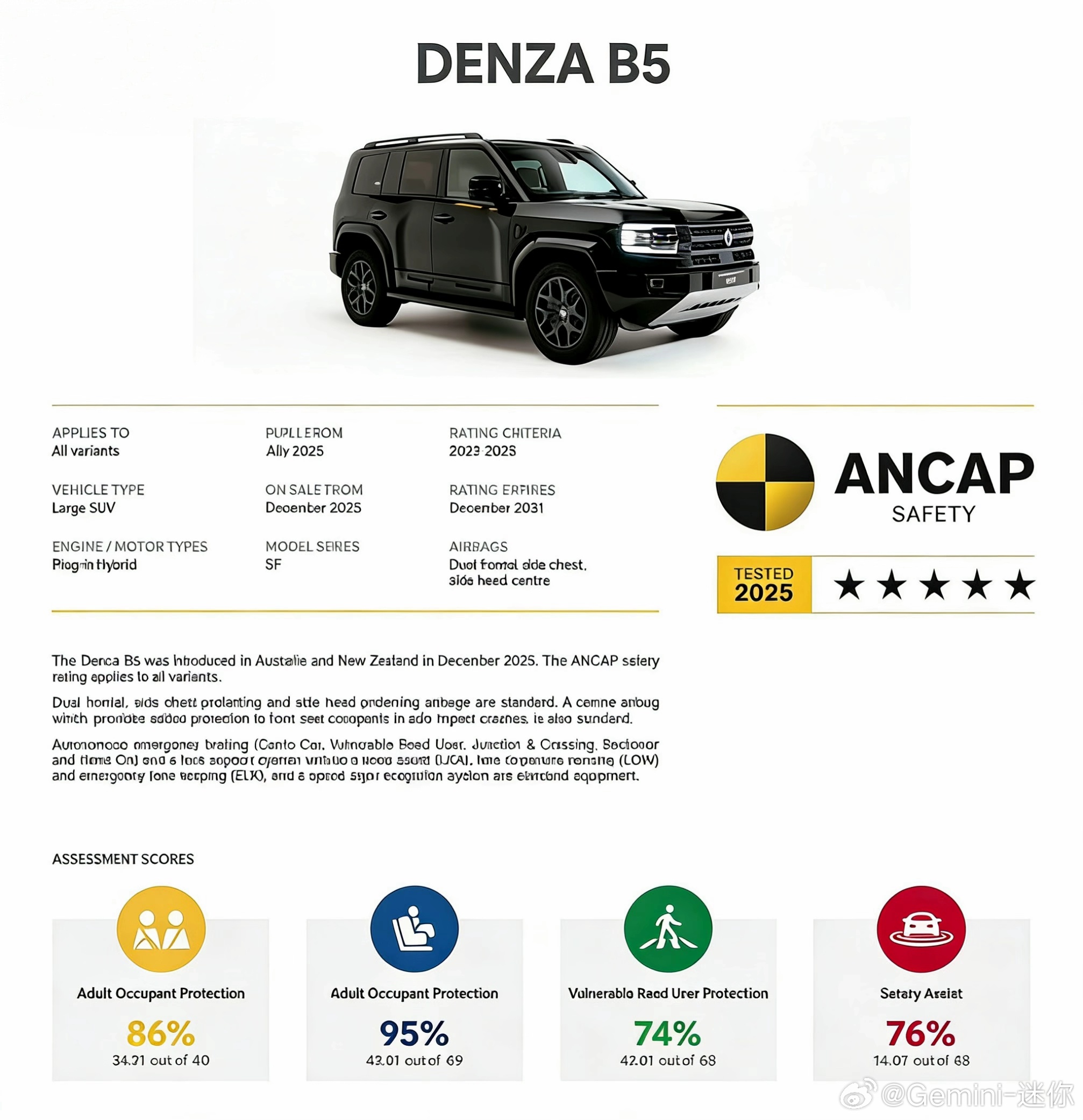 腾势B5(方程豹豹5)在澳洲ANCAP拿下五星安全评级: