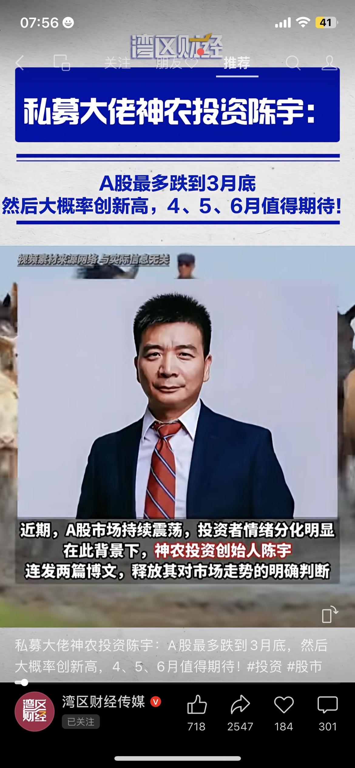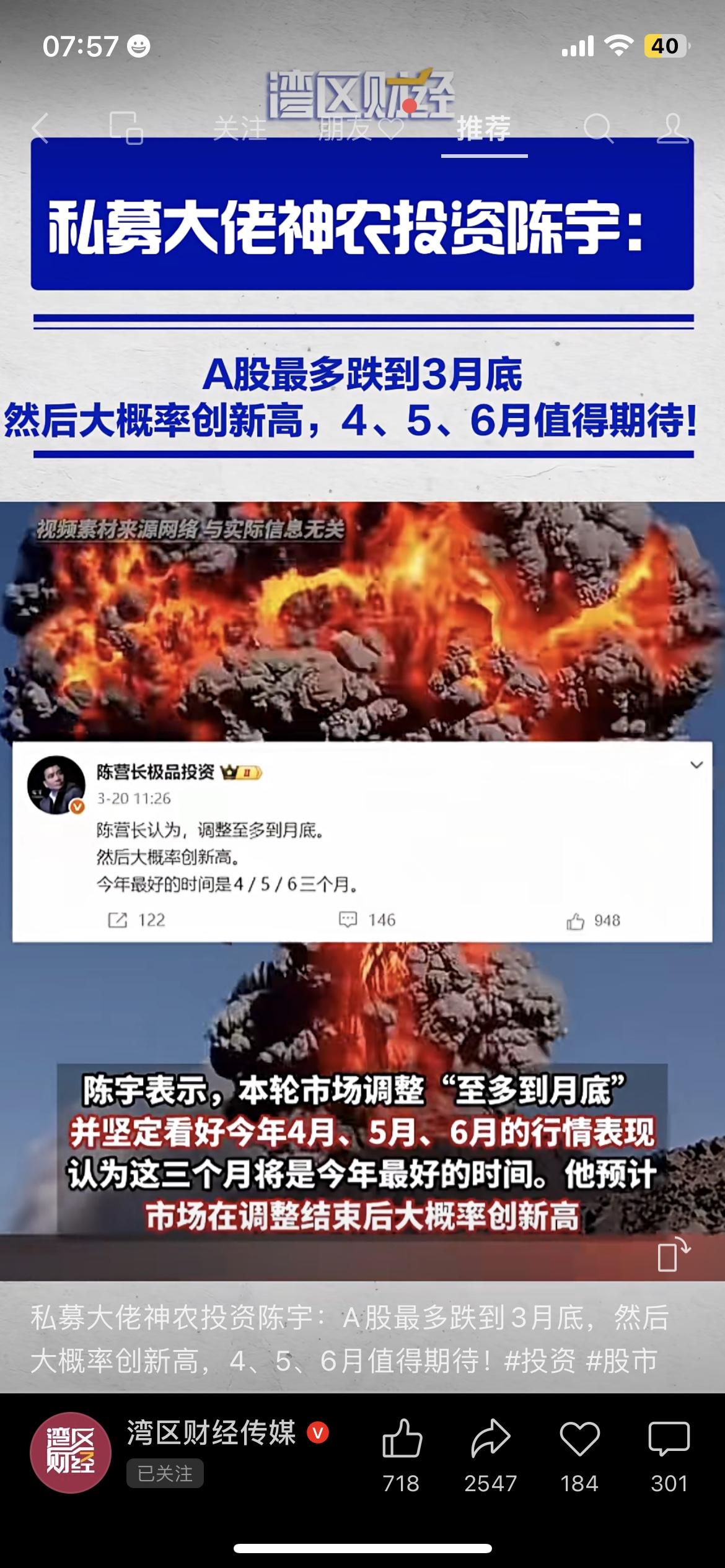 私募大佬看好A股二季度,认为调整大概率在三月底结束 私募人士陈宇近期公开表态,A股这轮调整大概率到三月底就会告一段落。 他比较看好今年四五六月份的行情,认为之后市场有望走出向好趋势。 不过市场变化很快,任何人的观点都只能作为参考,普通人还是要理性看待。 A股行情 二季度投资 股市观点 理性投资 市场有风险,投资需谨慎。