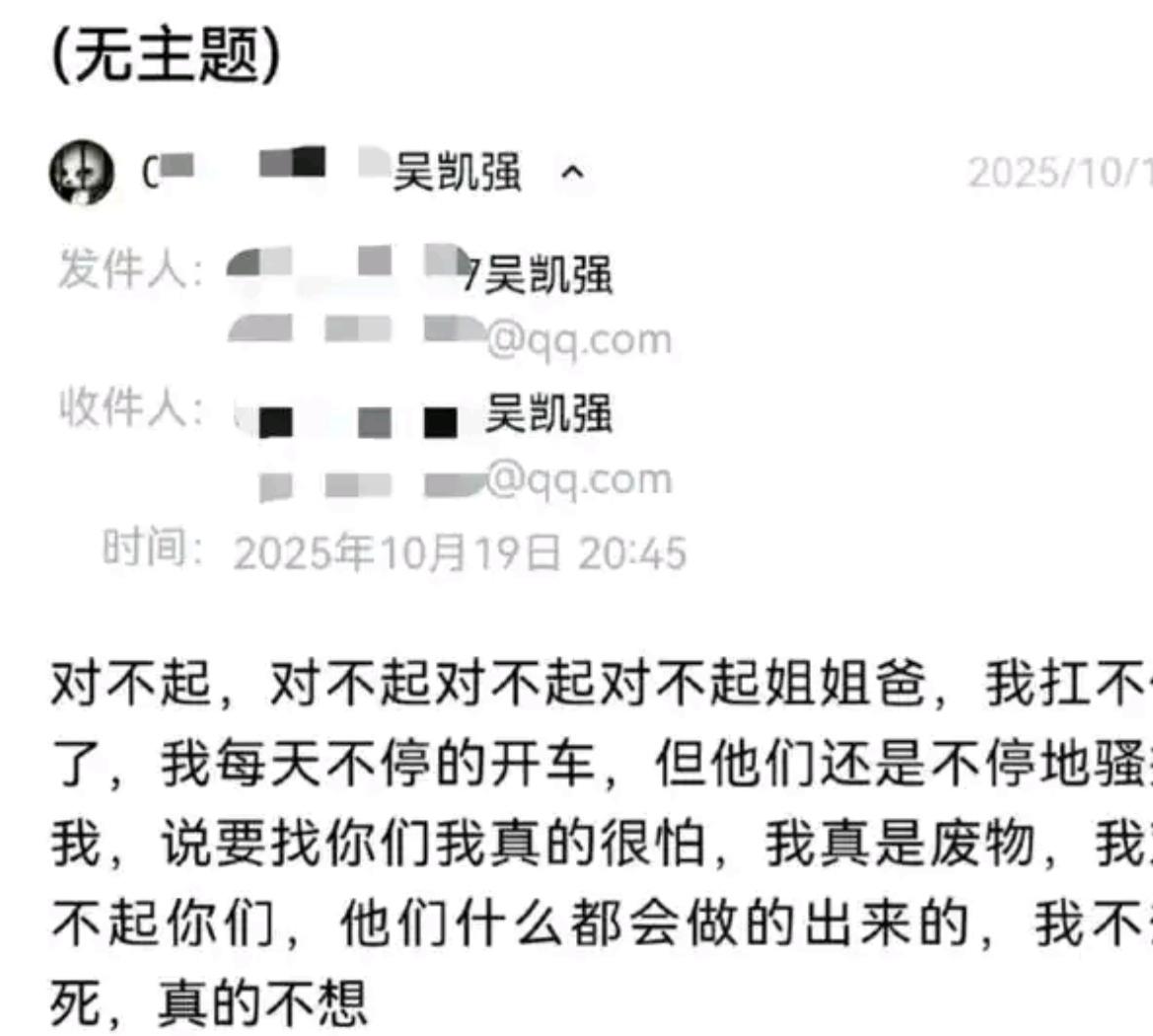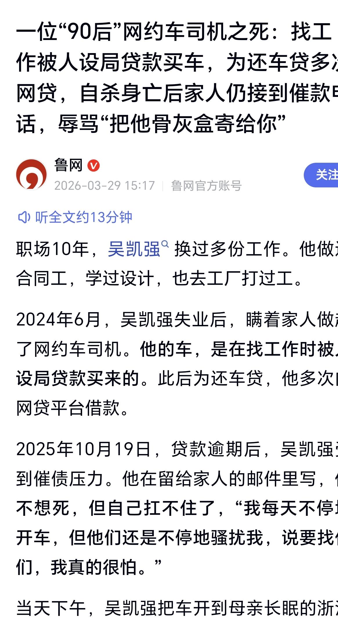 浙江东阳,一33岁网约车司机选择在母亲的公墓旁结束自己的生命,他因陷入了“贷款买车”的陷阱,然后背上了高额的债务,遭遇无休止的催债电话,最终他走到了绝路,没想到的是他去世后,家人竟然还被催收人员威胁。 信息来源:鲁网 这件事的起因,是吴凯强失业后在招聘平台上看到的一则“高薪”司机招聘信息。 招聘者称保底月薪1.2万,还承诺公司会配车,并且没有押金要求。 看起来条件相当不错,吴凯强一时心动,联系了招聘者,并约好第二天去面谈。 然而,当吴凯强赶到面谈现场时,招聘者并没有提到任何具体的工作内容,而是拉着他去看车、签合同。 等他反应过来时,自己已经签下了贷款合同,名下多了一辆14万元的汽车,还背上了19万元的贷款,贷款分60期,每个月要还3194元。 而最让人失望的是,招聘者承诺的高薪工作并没有兑现,吴凯强只能自己注册网约车平台,开始跑顺风车。 然而,他的困境才刚刚开始。 车辆的保险单上写着“非营业”,意味着吴凯强根本不能把车用于营运, 一旦被查到,就是非法运营。 虽然他在接顺风车单时偶尔能赚到4000多元,但大多数时候收入都不足3000元,远远不够支付每月的车贷。 为了偿还债务,吴凯强开始向网贷平台借款,借贷金额逐步攀升,最终他背负了十几万元的债务,陷入了恶性循环。 随着债务的增加,催收电话接连不断,吴凯强的生活变得越来越压抑。 那些催收人员不断打电话给他,还威胁他的家人,甚至泄露了他们的个人信息。 2025年10月19日,网贷逾期的第一天,催收的电话和短信便开始疯狂轰炸。 催收人员甚至通过支付宝转账0.01元来挑衅他:“看看你能躲多久”,而他的浏览记录显示,他当时已经搜了80多条关于“死亡方式”的内容。 吴凯强忍受了巨大的精神压力,在给家人发了最后的邮件后,选择了结束自己的生命。 在邮件中,他向家人道歉,表示自己无法承受不断骚扰和压力,他感到自己是个废物,拖累了所有人。 然而,即使吴凯强去世后,催收的电话和骚扰并没有停止。 他的家人依旧收到了恶劣的威胁和辱骂。 一名催收员甚至用湖南方言对吴凯强的姐姐进行辱骂,威胁说:“把他骨灰盒寄给你。” 而且,催收短信中还公开了吴凯强及其家人的身份证号,威胁说:“一群十六七岁的小年轻,会做出什么事情,咱也保证不了。” 这一切的发生,揭露了一个更加严重的社会问题——虚假招聘、套路贷和暴力催收的黑色产业链。 吴凯强并非唯一的受害者,这种“套路运”骗局已经在不少地方上演。 求职者被引诱进入骗局,借上高额贷款,最终债务无法偿还,被催收公司无情追讨。 吴凯强的家人报警后,案件一度因证据不足未能立案,但律师的帮助使得案件最终在2026年2月27日立案。 催收人员的恶劣行为已经触犯了法律,《民法典》第962条规定,任何中介人在签订合同时,必须如实报告相关事实,而这个案件中的中介明显隐瞒了关键信息。 除此之外,催收人员泄露个人隐私、威胁骚扰他人,已经构成犯罪,应当依法追究刑事责任。 吴凯强的悲剧,令人痛心,但也暴露了当前社会中的种种乱象。 求职骗局、网贷暴力催收,这些黑色产业链不仅摧毁了吴凯强的一生,也让他的家人深陷痛苦之中。 这一事件也提醒我们,相关行业的乱象亟待整治,唯有让更多人警醒,才能避免类似的悲剧再度发生。