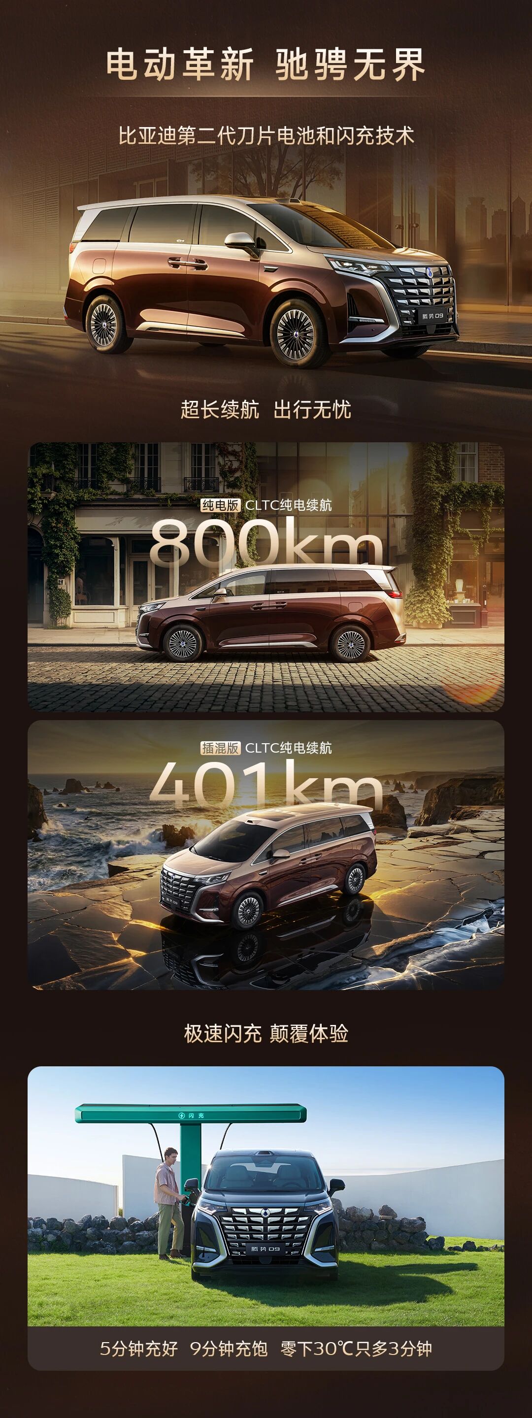 3月29日,第二代腾势D9正式开启预售,新车提供插混版和纯电版共计6款车型,新车长宽高分别为5250/1960/1900mm,轴距为3110mm,定位中大型豪华MPV,与现款车型保持一致。预售价为38.98-48.98万元。新车全系搭载天神之眼5.0智能驾驶辅助系统,最大的亮点是全面搭载支持闪充技术的第二代刀片电池,可实现“5分钟充好,9分钟充饱”,插混版CLTC纯电续航里程最高401公里,纯电版续航最高达800公里。 外观方面,新车前脸采用重新设计的 π-Motion 钻石切割造型,全新格栅层次更为丰富立体,在保留宜商宜家的优雅稳重气质的同时,整体风格在豪华大气的前提下增添了立体层次感和科技感。插混版和纯电版车型采用相同的前脸设计。车顶标配激光雷达以及天神之眼5.0智能驾驶辅助系统。 它会是你换车的首选吗?